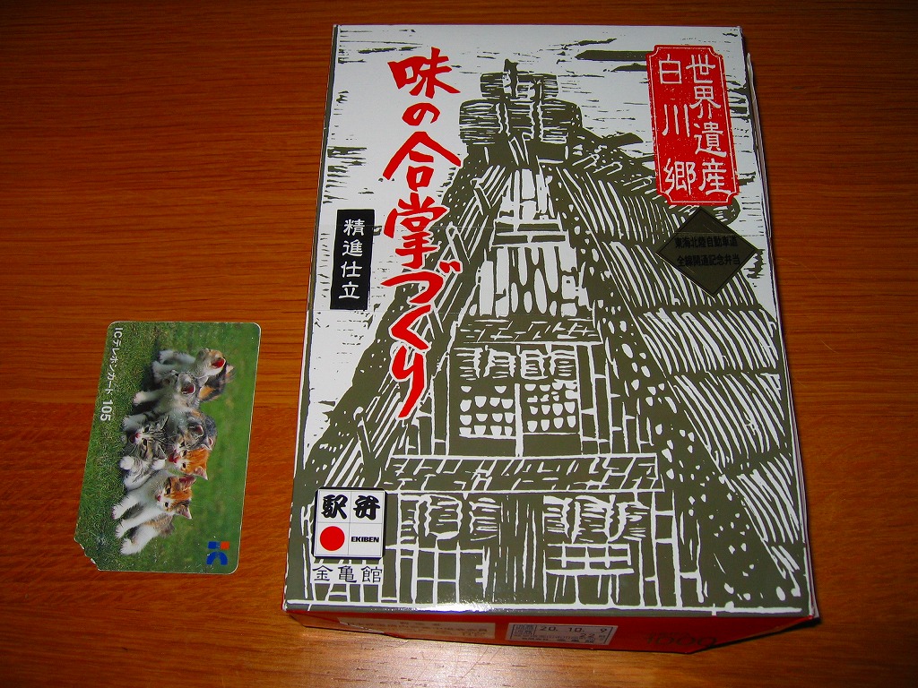 2008(平成20)年10月9日に購入した、高山駅弁のふた。1960年の「飛騨べんとう」から変わらない、合掌造の版画絵が使われる。ここではこれに「東海北陸自動車道全線開通記念弁当」というシールを貼った。交通から隔絶された山奥がゆえに、合掌造の集落が残ったたことで開発から守られて保存の機運が生まれ、1995(平成7)年12月にはユネスコの世界文化遺産に登録された五箇山や白川郷は、愛知県一宮市と富山県砺波(となみ)市を結ぶ東海北陸自動車道が2008(平成20)年7月に全通したことで、名古屋や富山や金沢までクルマや高速バスで1時間から3時間くらいで行ける、交通至便な、交通渋滞や駐車場不足に悩む賑やかな観光地に変貌した。