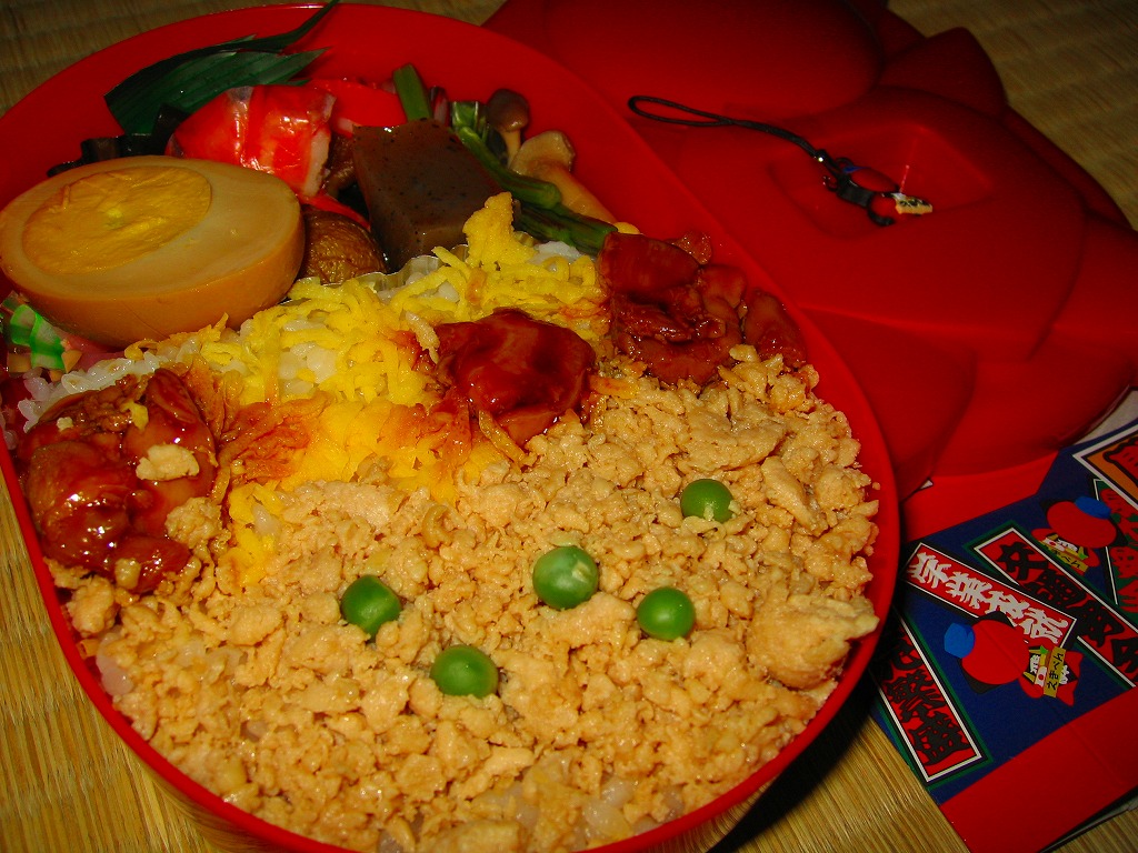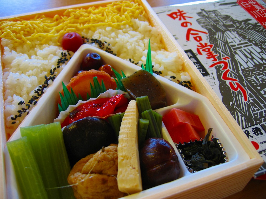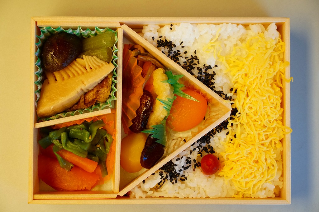 中身の写真は横長のため右に90度回転させたが、おかずを手前下部に、御飯を奥の上部に配置するのは、合掌造りの茅葺きの黒屋根に白い雪が降り、黄色い雲と赤い太陽が輝く意図でつくられている。その御飯と錦糸卵と黒ごまと梅干しに、れんこんの天ぷらと山菜とアンズやくりなどと、タケノコやフキなどの煮物と、山くらげと大根の漬物を詰める。