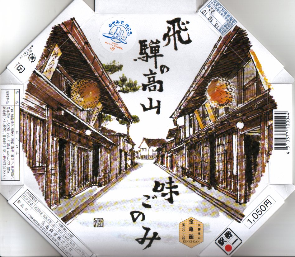 上記の駅弁「味ごのみ」の、2024年時点での姿だと思い、高山駅で購入。市販の四角い仕出し弁当向け容器に、国指定重要文化財日下部民藝館の写真を使う掛紙を巻き、飛騨高山名所シリーズを名乗る。中身は上記の2003年のものとだいたい変わらず、日の丸御飯、煮魚とかまぼこと玉子焼、海老や昆布などの煮物、山菜や煮豆、鶏唐揚、漬物など。しかしこの日の前も後もネット上では、上記の正八角形の「味ごのみ」の写真がアップされている。高山祭の開催日という繁忙時に限り、その姿と形を変えたのだろうか。