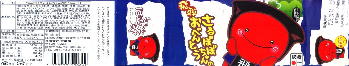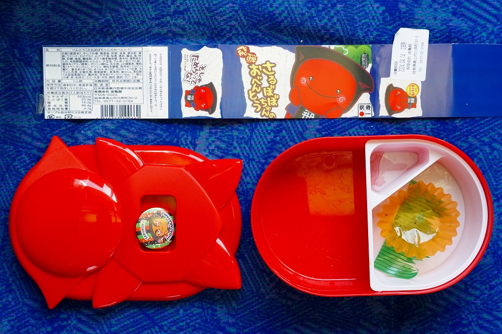 2006(平成18)年10月に発売。飛騨高山の郷土人形「さるぼぼ」型の赤いプラ製容器を使用、これに紙帯を巻いたりセロハンテープで留めて封とする。中身は白御飯の上に鶏そぼろと錦糸卵を敷いて焼き鳥3個を載せて、煮玉子や煮物に山菜などを添える、強いて言えば鶏親子飯。その分量や風味より容器のインパクトが大であり、選択基準はここに求めるべき。さるぼぼの駅弁立売ストラップが付いており、これを得るために買ってもよい。価格は2006年の発売時で1,050円、2014年4月の消費税率改定で1,080円、2022年時点で1,100円、2023年時点で1,200円。
