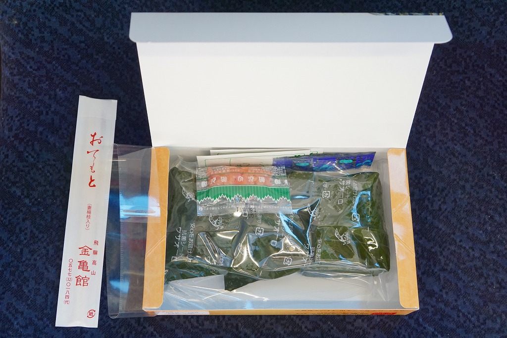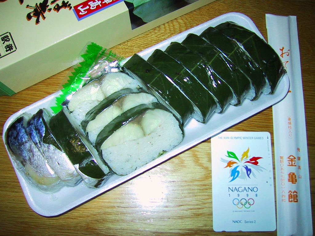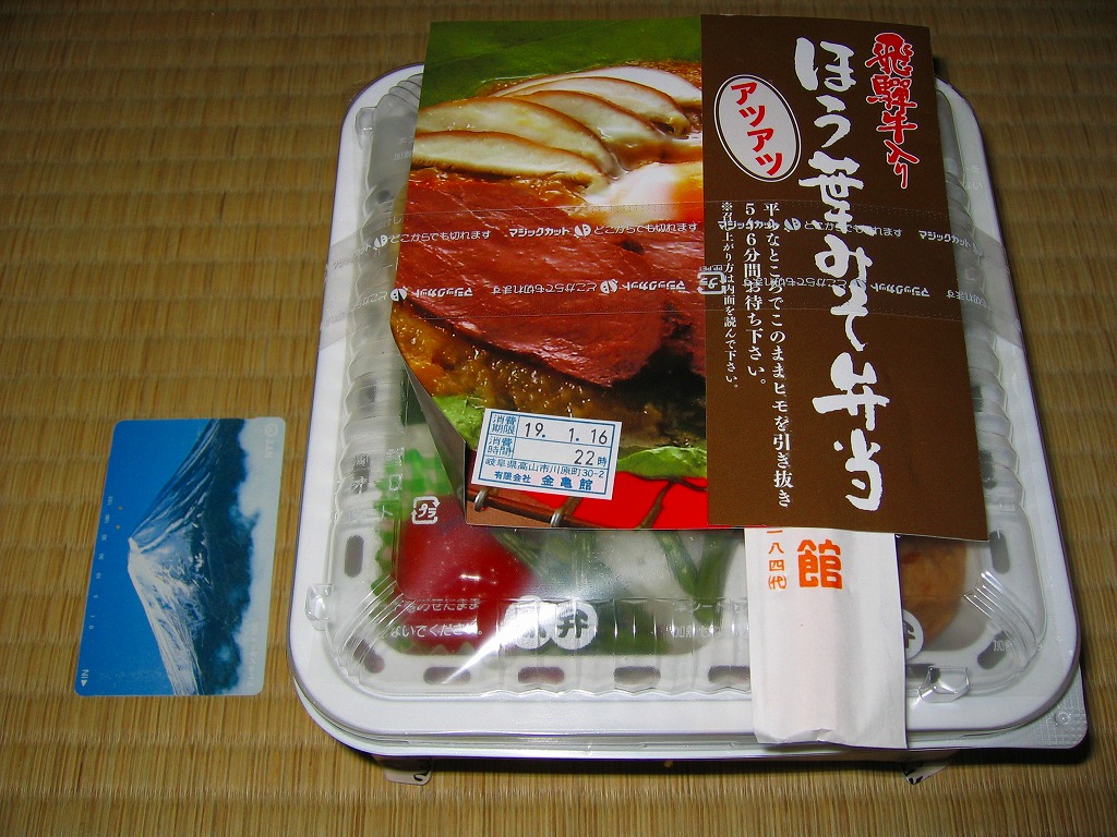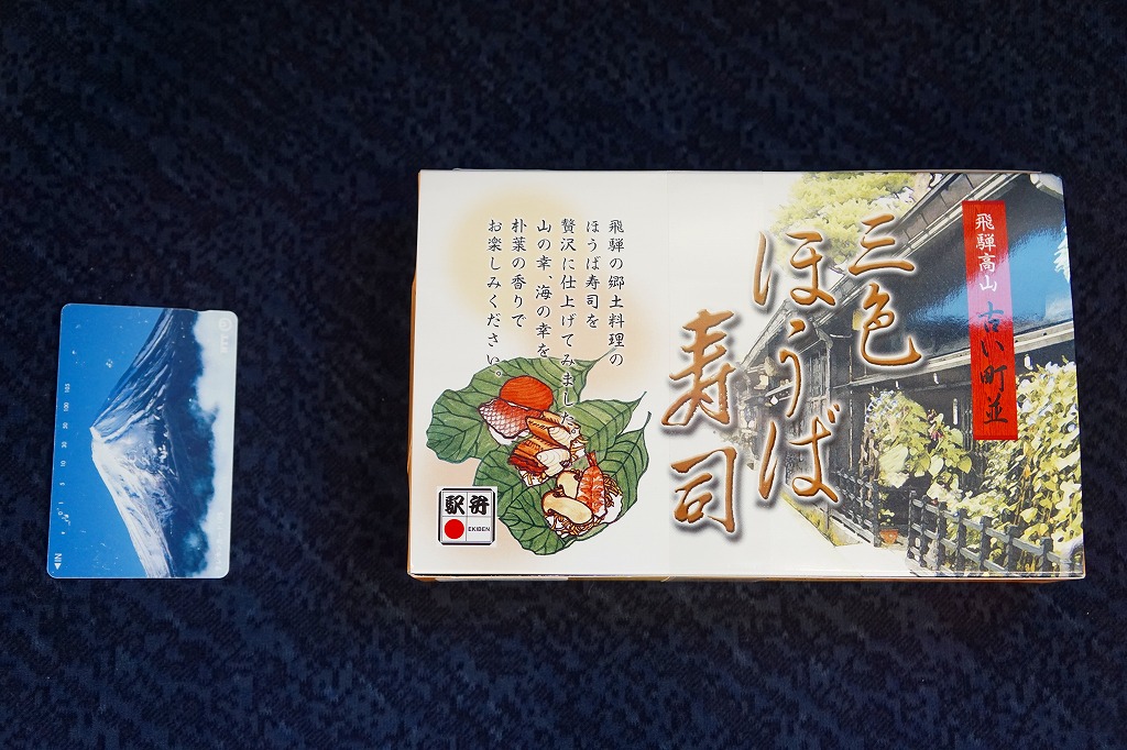飛騨高山の古い町並と、駅弁の中身をイラストで描いたボール紙の箱に、平たい具と酢飯を朴葉(ほうば)に包んだほうば寿司が、3個収まる。具はサケと小鯛、アナゴ、海老とマツタケ。3個まるごと「真空パック」にしており、これで消費期限が翌日昼までという、持ち歩きに便利な商品になったが、一方でこの包装により、手触りも風味も食感もべちゃっとなり、葉の香りは消えてしまった。価格は2002年時点で1,260円、2014年4月の消費税率改定で1,300円、2023年時点で1,400円、2024年時点で1,500円。