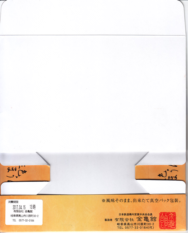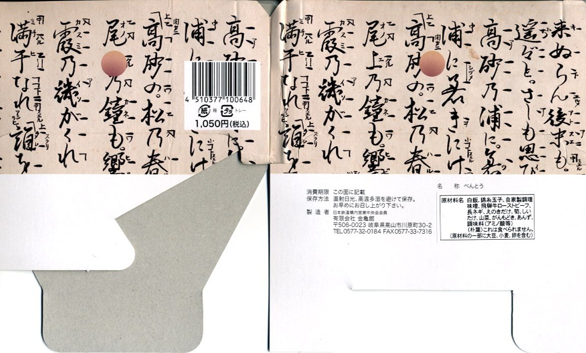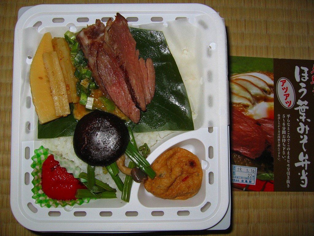 外観の見栄えや中身の構成に完成度は高い。しかし大規模催事での大量実演販売がたたったか、ほうばその他の香りは薄く、白御飯は無風味でべちゃべちゃ。それに中身が添付のイメージ写真とかなり異なる。現地ではどうだろうか。価格は購入時で1,050円、2015年時点で1,150円。2015年か2017年頃までの販売か。
