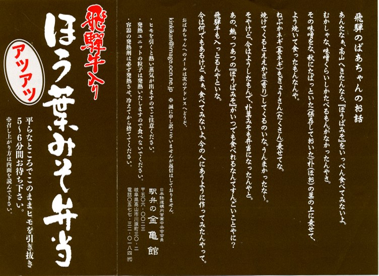 2006(平成18)年10月のリニューアル。飛騨コンロを模した、漢文のようで平仮名混じりの文字を埋める側面デザインの、四角形の加熱機能付き容器を使う。中身は白御飯の上にほう葉を敷いて味噌を塗り、その上に飛騨牛ローストビーフ、ネギ、タケノコ、ゴボウなどを載せるとともに、椎茸やアンズやがんもどきなどを添える。