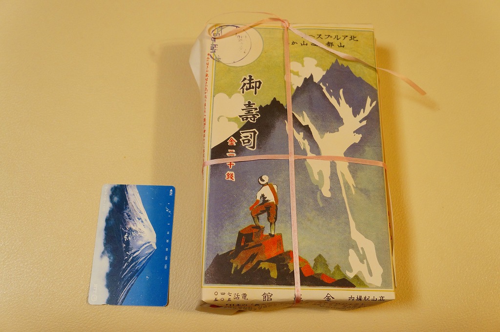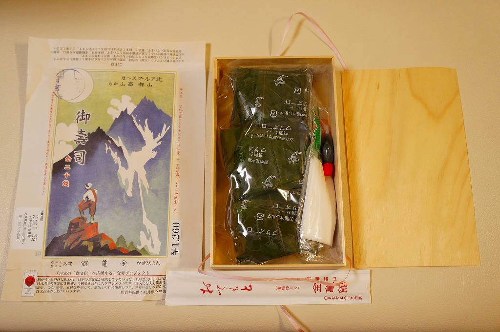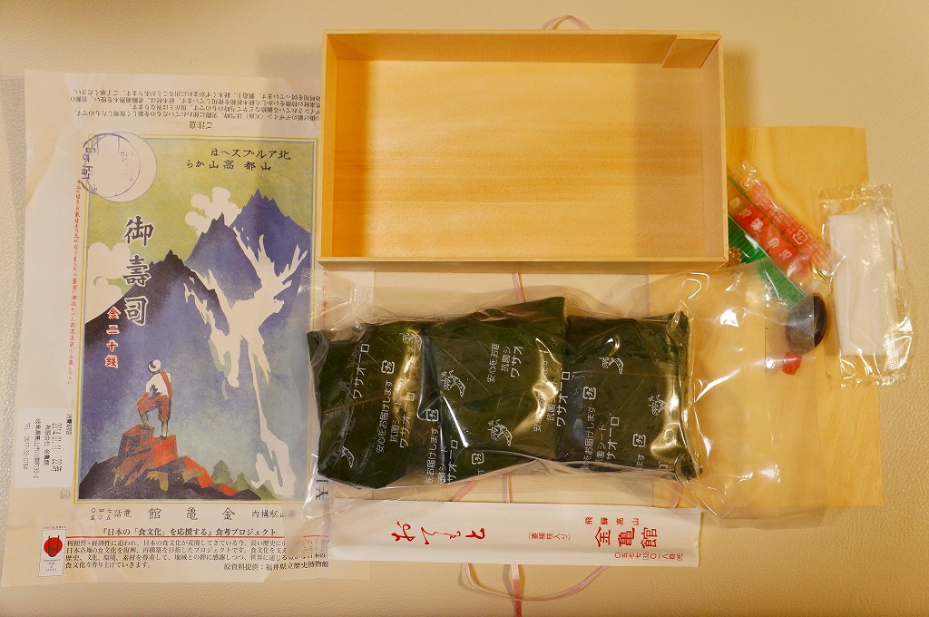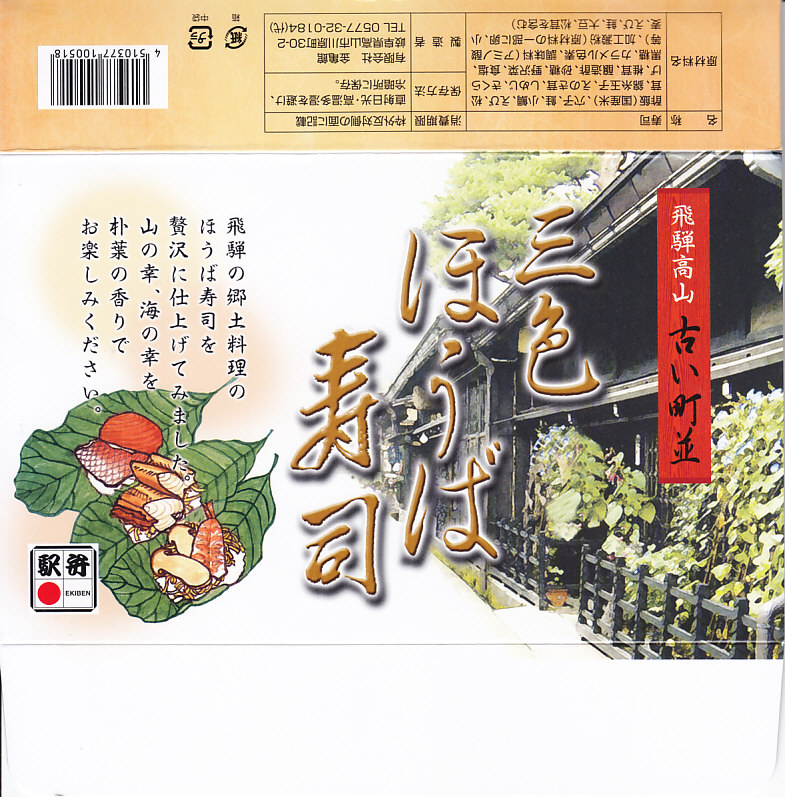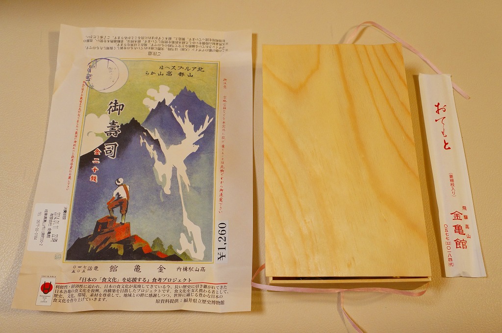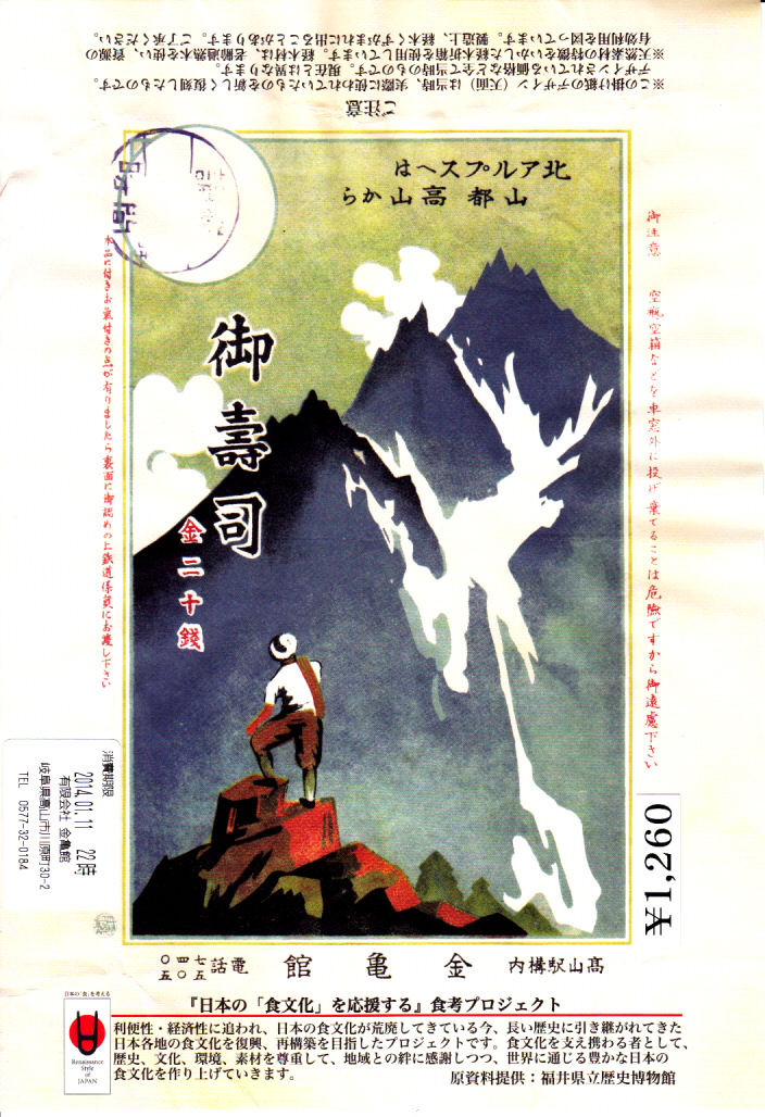 2014(平成26)年1月の京王百貨店の駅弁大会で販売された復刻駅弁。昔ながらの経木折に、戦前の駅弁掛紙の絵柄を取り入れた掛紙で包む。中身と価格は、上記の駅弁「三色ほうば寿司」と同じ。真空パック入りであることも同じなので、経木折を使う意義がない。高山駅の昔の駅弁掛紙は、美しいものが多いと思う。