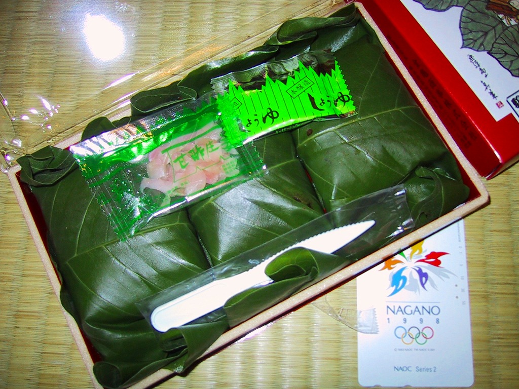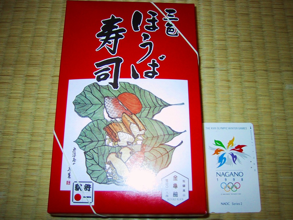 上記の高山駅の駅弁「三色ほうば寿司」の、2002(平成14)年時点での姿。中身は変わらず、価格もほぼ据え置きだが、当時は真空パックでなかったため、朴(ほう)の葉がみずみずしく、寿司の香りと口当たりが抜群であっった。容器に描かれた中身の日本画は、新しい絵柄のパッケージにも引き継がれている。
