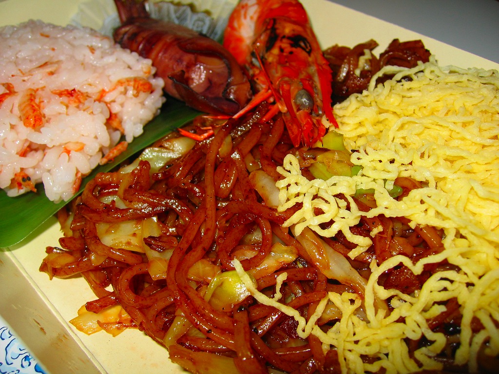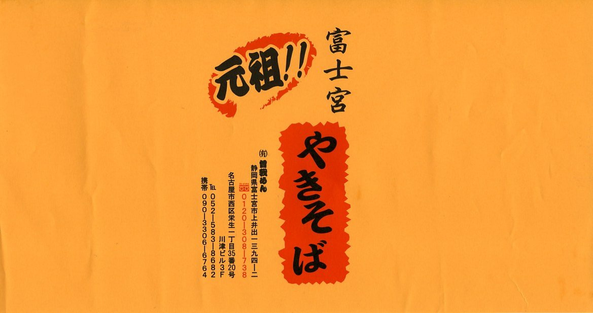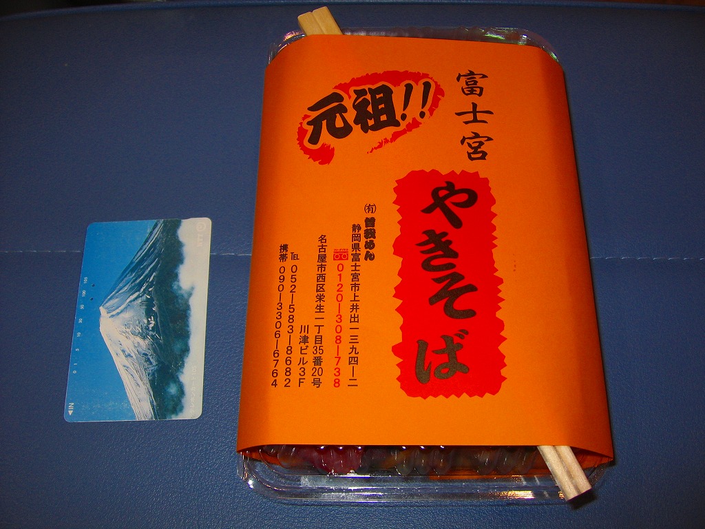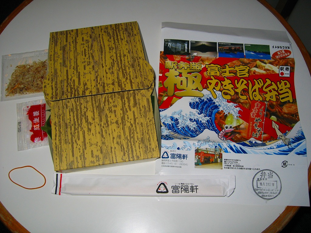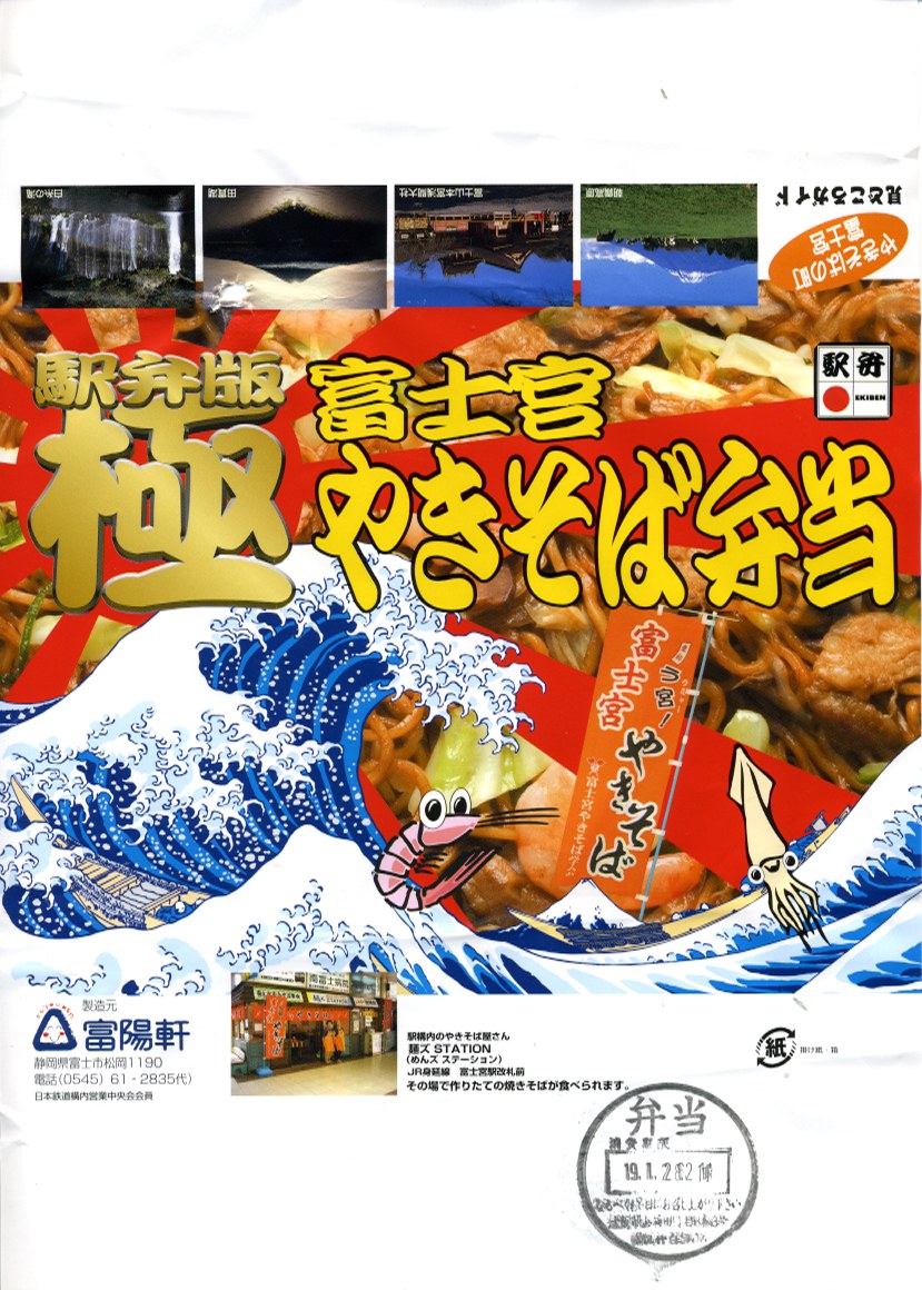 2005(平成17)年11月14日に新富士駅と富士宮駅で発売した、史上初のやきそば駅弁。現地版は加熱機能付き容器を使用して980円で売られるが、写真は百貨店駅弁催事での実演販売版。竹皮柄の紙容器に焼きそばを詰めて錦糸卵を添え、その隣に笹の葉を敷いて桜海老おにぎりと煮イカと有頭海老を置き、ワサビ茎を付ける。