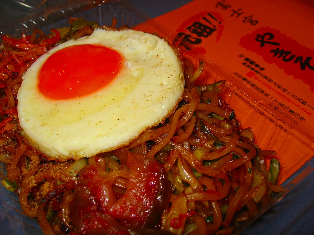 駅弁がほとんど売られていない駅弁催事で、代わりに買った催事用富士宮やきそば。ネギやタマネギなどを混ぜて炒めた焼きそばに目玉焼きを置いて、桜えびをまぶして柴漬を添えて500円ちょっと。味は見たまま。掛紙記載の調製元情報は公式サイトのものと違うのだが、駅弁でないので詮索はしない。