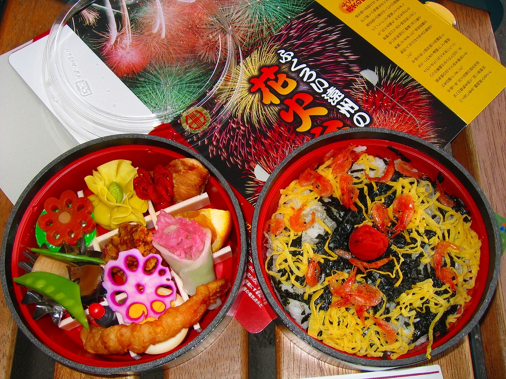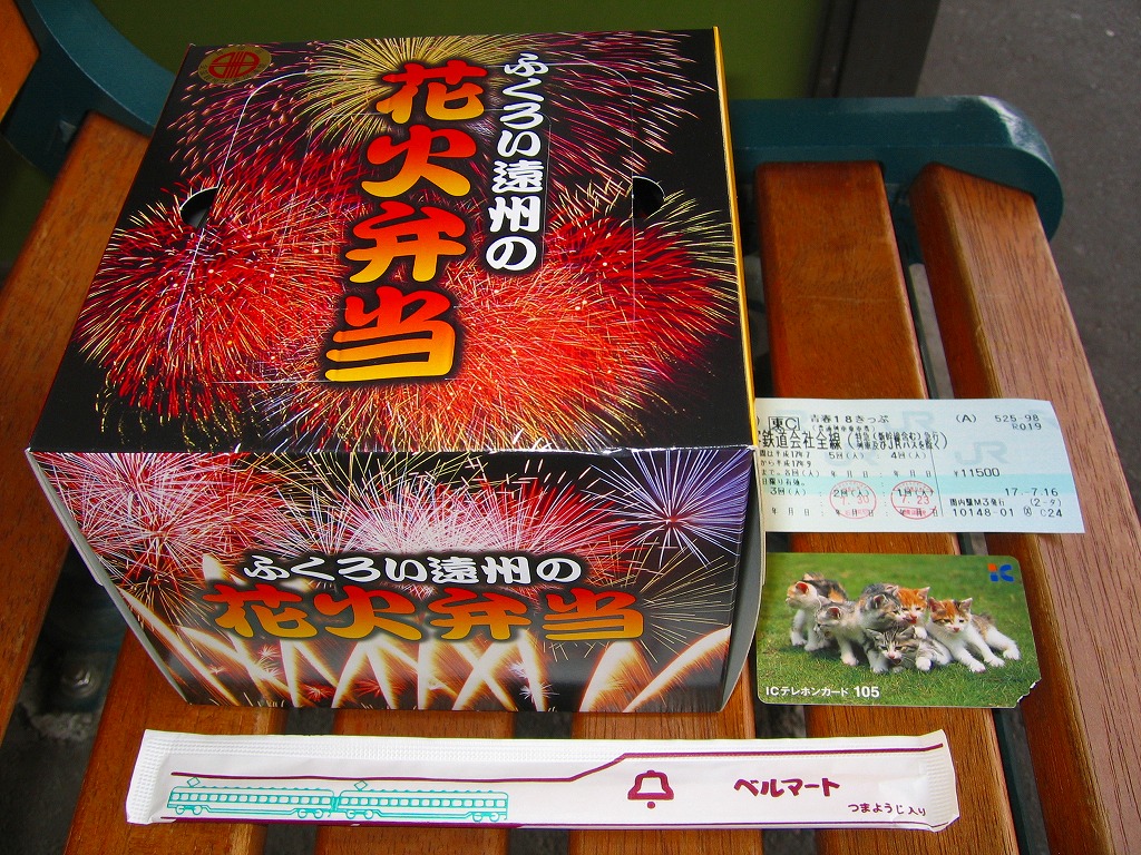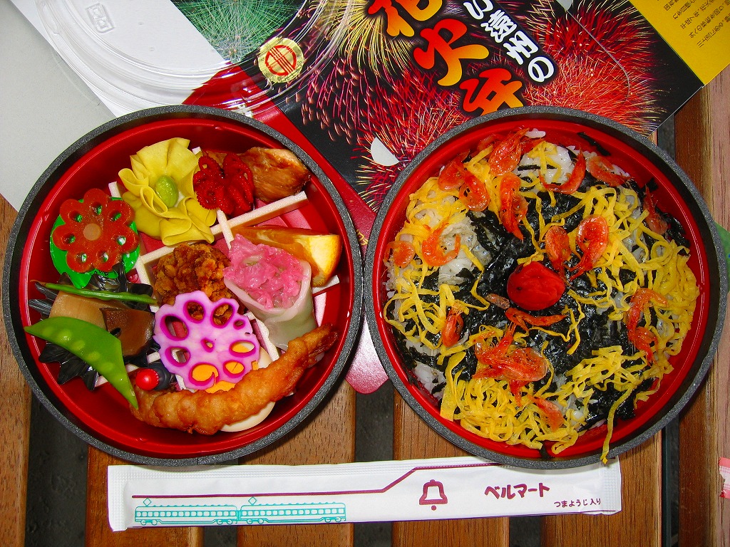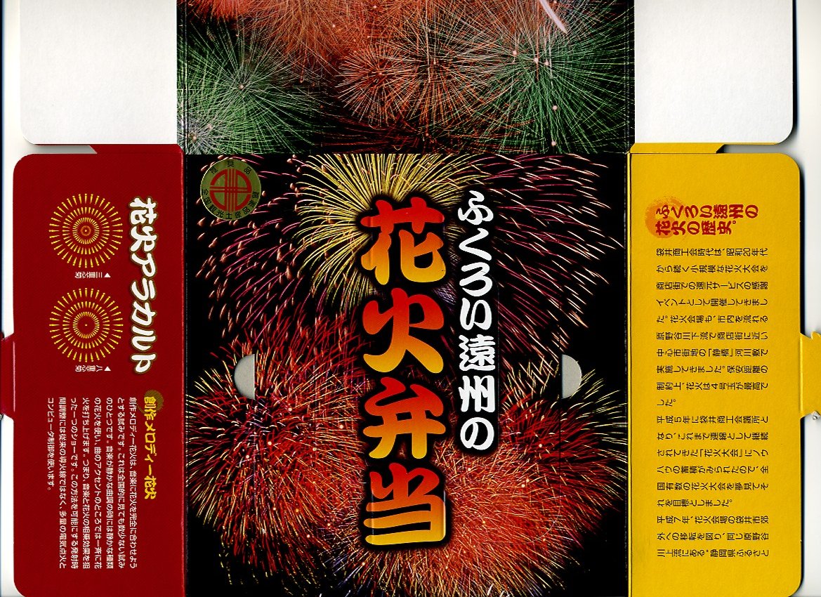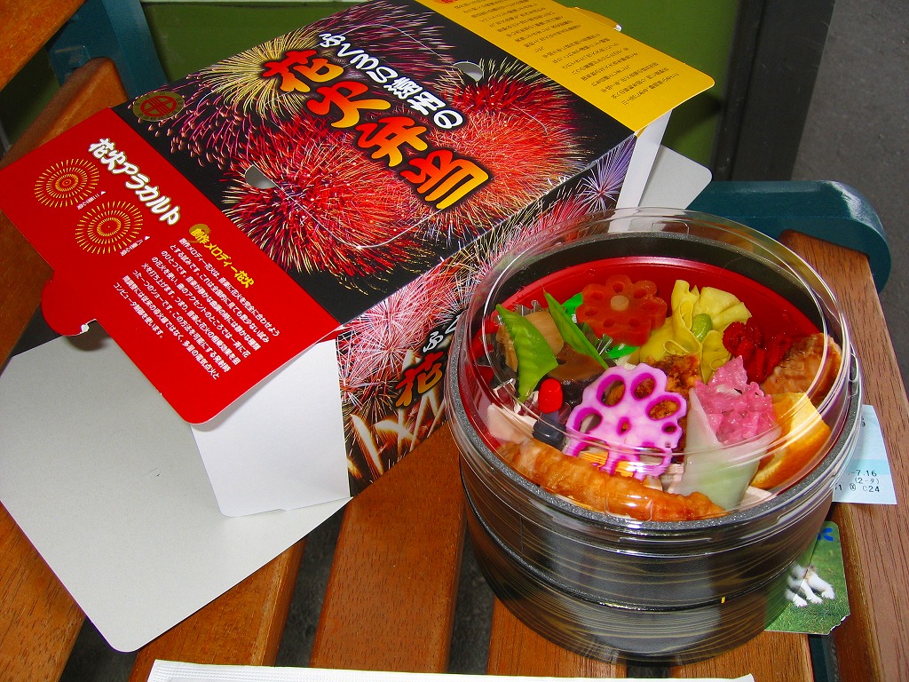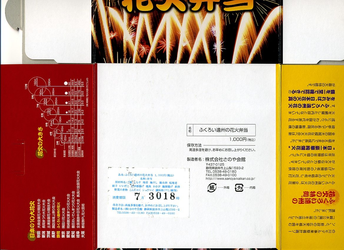 駅弁のパッケージには見えない、花火大会の写真をふんだんに使った大きなボール紙箱に、二段重ねの円形の容器を詰める。中身は下段が桜海老と錦糸卵と刻み海苔とシラスをまぶして花火に見せた御飯、上段が花火型にくりぬいた花レンコンやニンジンに、イイダコやコンニャクや玉子などでも花火を演出し、焼き魚や煮物やオレンジなどを添える。感想は「盛り沢山」の一言。