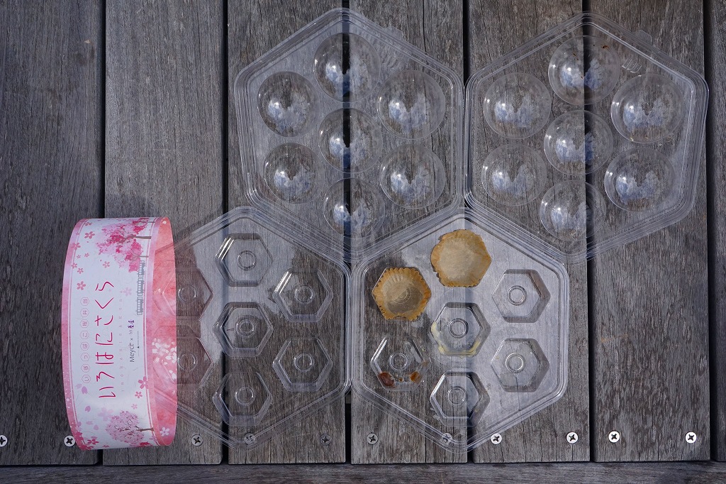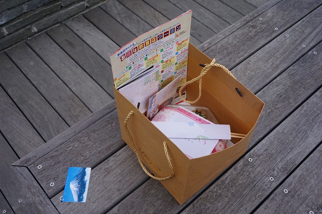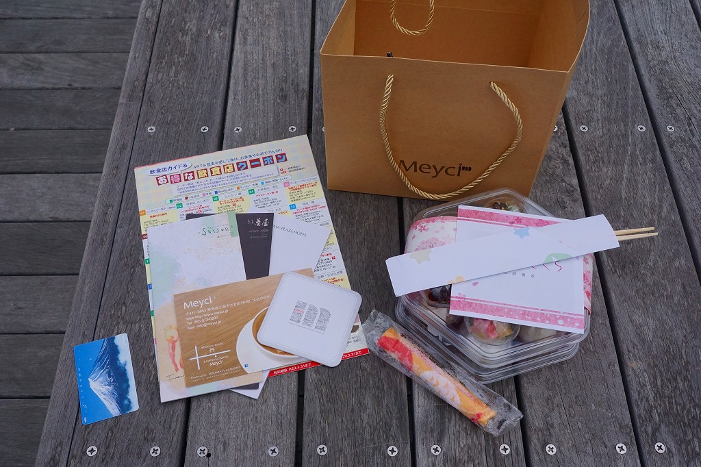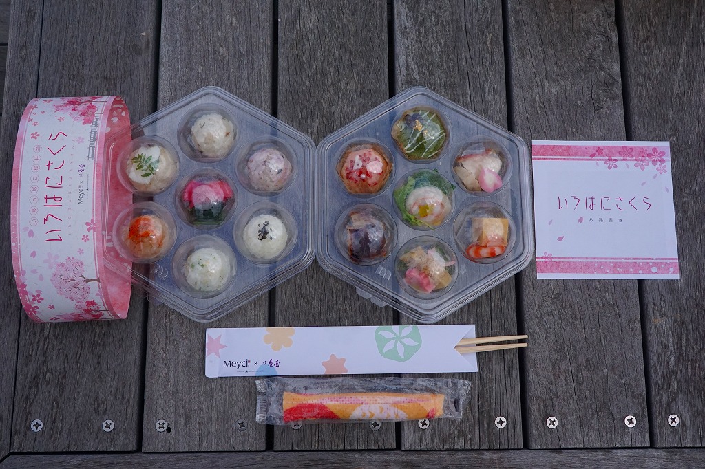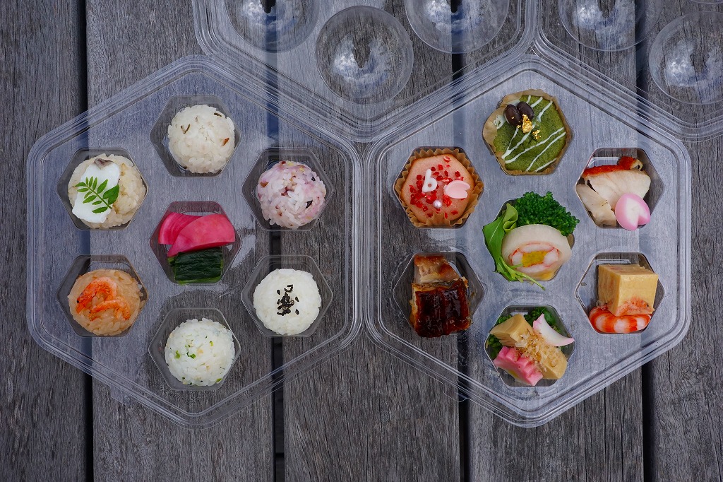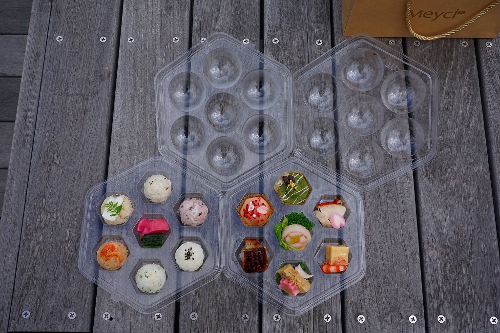 7つのくぼみを持つ、透明な正六角形のプラ製容器をふたつ重ね、掛紙を巻いて、様々なチラシとともに紙袋に収める。中身は一方が桜おこわ、梅おこわ、白米、菜飯、桜海老ご飯、鯛ご飯で6個の手まり飯と漬物、他方にウナギ蒲焼や桜海老玉子焼や金目鯛や焼き菓子など、同じサイズのおかずが7個分。見栄えと香りがとてもおしゃれで、こんなに少量な弁当を、2000円で買おうと思う客の発掘が最大の課題だと思った。