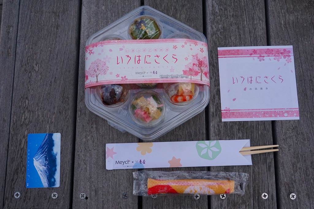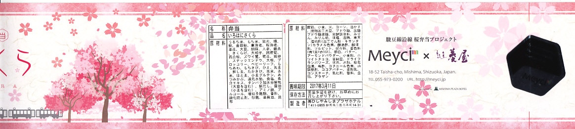 2017(平成29)年3月5,11,12,18,19日の5日間に、伊豆箱根鉄道三島駅と特急列車「踊り子」105、109号の三島田町駅〜修善寺駅の車内で、各日30個ずつを販売。伊豆箱根鉄道駿豆線沿線の3市1町と鉄道会社で構成する「駿豆線沿線地域活性化協議会」と静岡県が、地元食材を使用した駅弁をきっかけに伊豆半島や駿豆線沿線の観光地に足を運んでもらおうと、三島市内のホテルとともに開発した「駅弁」。続いて3月18〜20日と25,26日には「いずっぱこ桜弁当満開」が、伊豆長岡駅と修善寺駅と踊り子号で販売されたという。