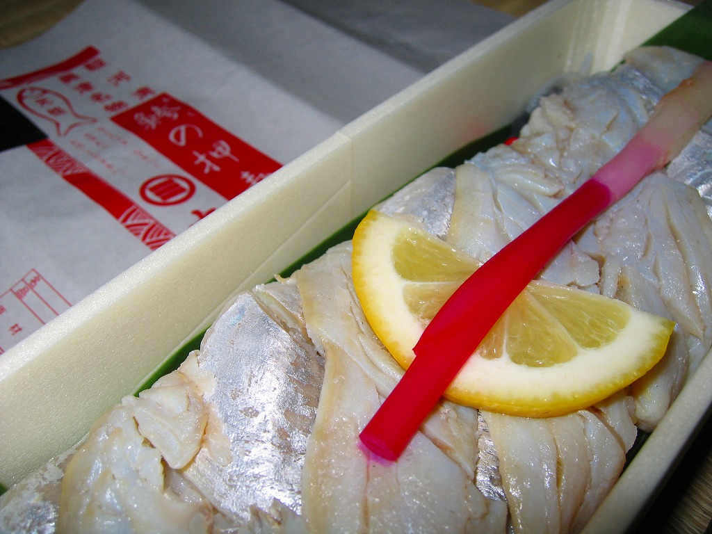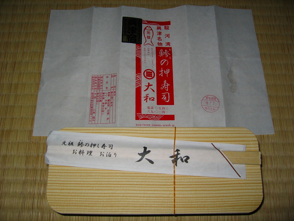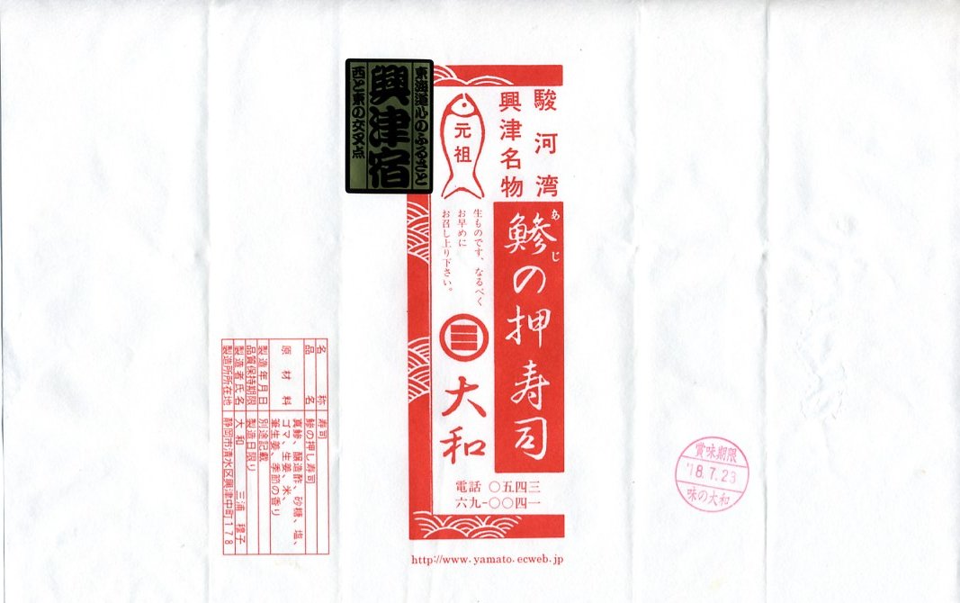 静岡地区の駅のキヨスクで、幅広く売られているらしい駅売り商品。細長い容器に木目調の紙ぶたをして、割りばしを置いて輪ゴムでしばり、掛紙を巻いてセロテープで留める。中身はアジの押寿司1本が、笹の葉を敷いて、レモンと生姜を載せて、醤油を添えて置かれるもの。味はまあまあ。雑なつくりに手作り感がある。