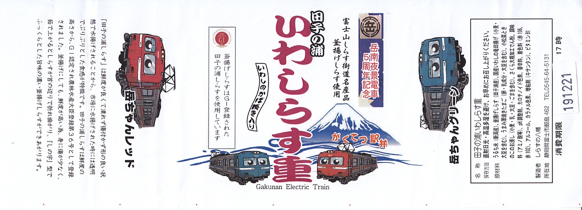 岳南電車の「夜景電車」5周年を記念し、2019(令和元)年9月14日に発売された、岳南電車史上初の駅弁。夜景電車の運行時に予約販売されるほか、土曜日に限り11時以降の吉原駅での受取で事前予約により販売される。長方形の容器で白飯をシラスで覆い、イワシ竜田揚の棒を1本載せ、玉子焼、小松菜おひたし、大根桜漬を添付する、駅弁らしい内容。シラスとイワシが味よりは香りで風味を出す、最高のシラス駅弁。ただ、立地と売り方から、知名度を広げようがない存在である気がする。