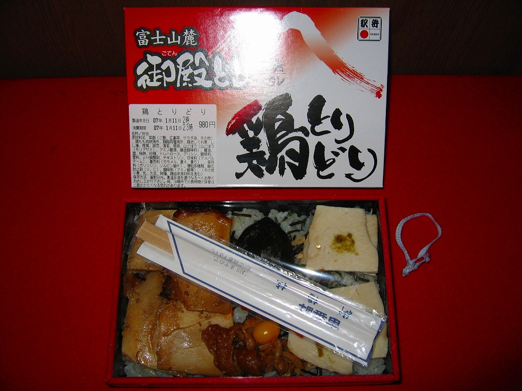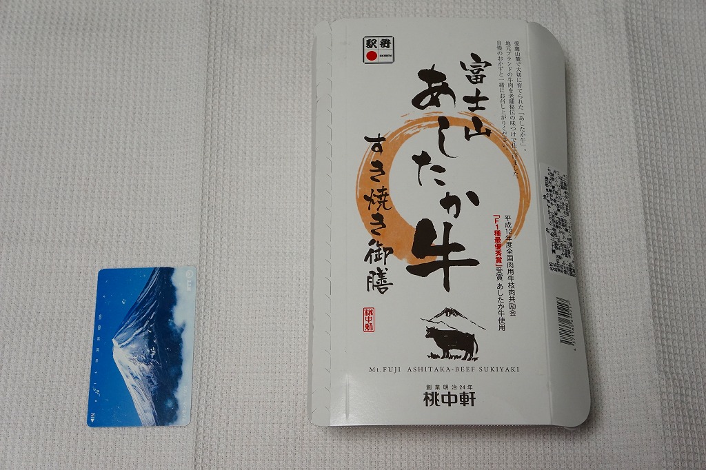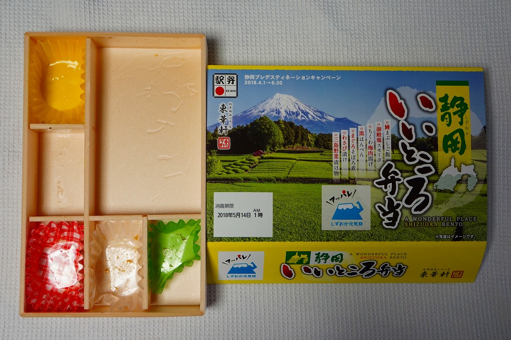 スリーブは2年前と同じ場所で撮ったとみられる富士と茶畑の写真と、様々なロゴマークでできている。おしながきに加えて写真もそこに加えた中身は、茶飯をキンメダイ有馬煮、豚しぐれ煮、サクラエビ甘煮、じゃこ塩茹で、錦糸玉子で覆う「山海彩りごはん」に、富士柄のかまぼこ、ハーブ鶏、ひじき煮、三島コロッケ、黒はんぺん、みぶなとわさびの醤油漬、わさび漬、箱根大根の漬物。静岡県の全体でなく東部、主に富士山より東側の内容でできていた。