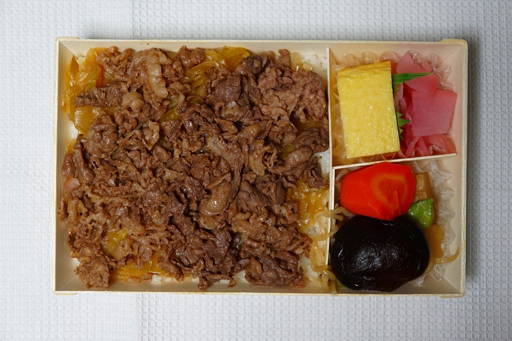 木製エコ容器に白御飯を詰め、牛肉煮とタマネギ煮で覆い、しらたきやシイタケなどの煮物、玉子焼、大根桜漬を添える。肉の固さとタマネギの多さで、牛丼や牛肉駅弁でなく牛すき焼きの弁当を食べている感じがたっぷり。2020年2月頃までの販売かもしれない。