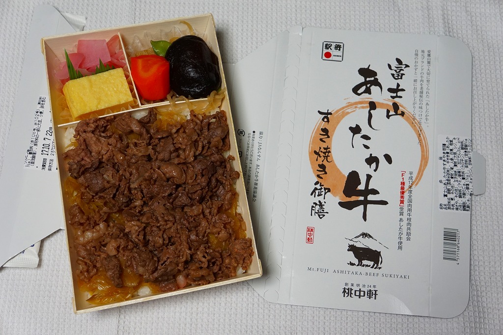 2016(平成28)年11月25日の熱海駅ビル「ラスカ熱海」オープンと同時に発売か。調製元は三島駅や沼津駅の駅弁屋だが、この商品は土休日に熱海駅で売られるという。三島駅や沼津駅で売られる駅弁「富嶽あしたか牛すき弁当」の、具と量を増した上等版。