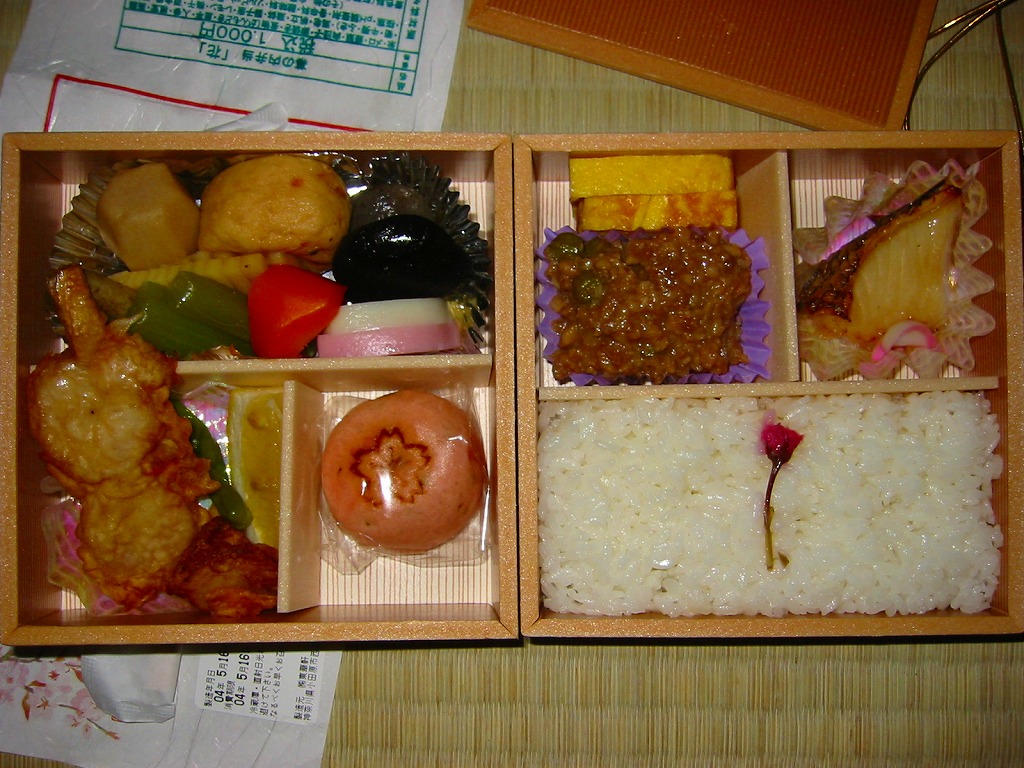熱海花の博覧会の開催に合わせて、2004(平成16)年3月頃に発売。木目印刷の美しい正方形の容器を重ね、和紙に桜を描いた掛紙をかけて金色の輪ゴムでしばる。中身は下段が桜花付白御飯に焼き魚と鶏そぼろと玉子焼、上段が煮物や紅白の蒲鉾に海老串に桜饅頭など。具の入るミニカップもほんのり桜色で、味が良い以上にそのコンセプトの明確さも風味を出す。現存しない模様。