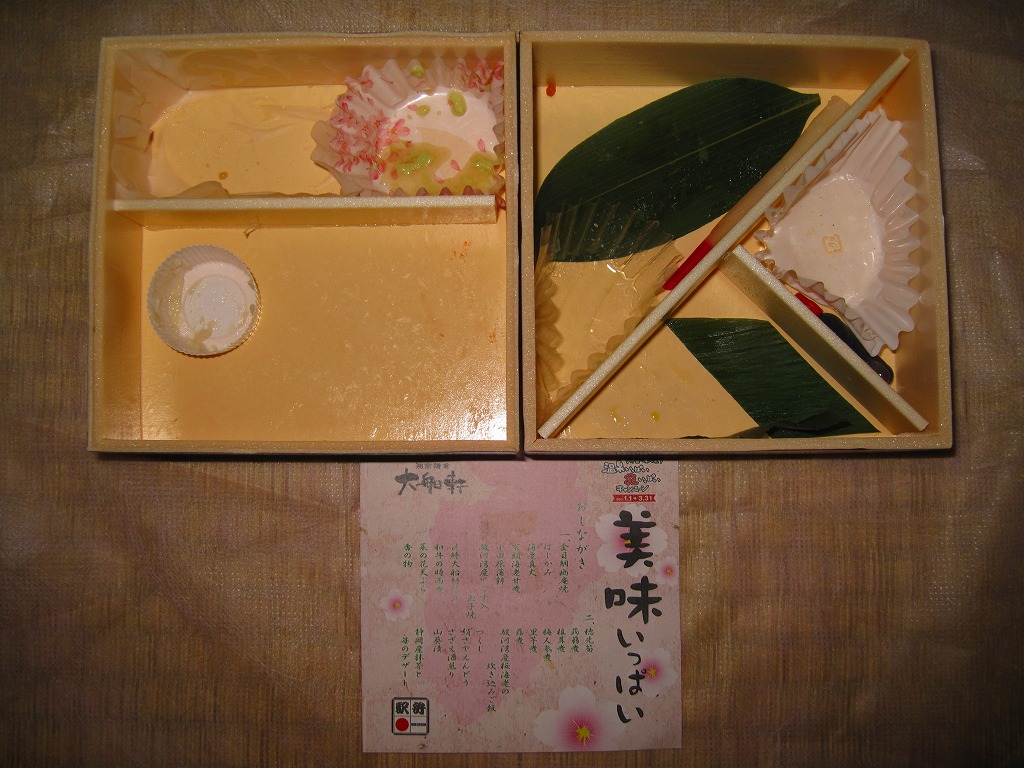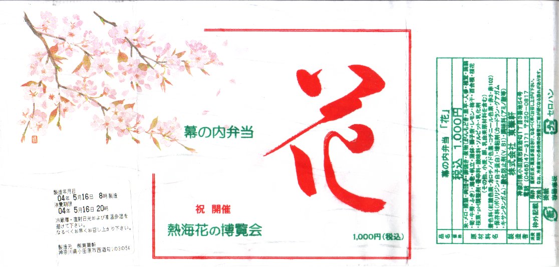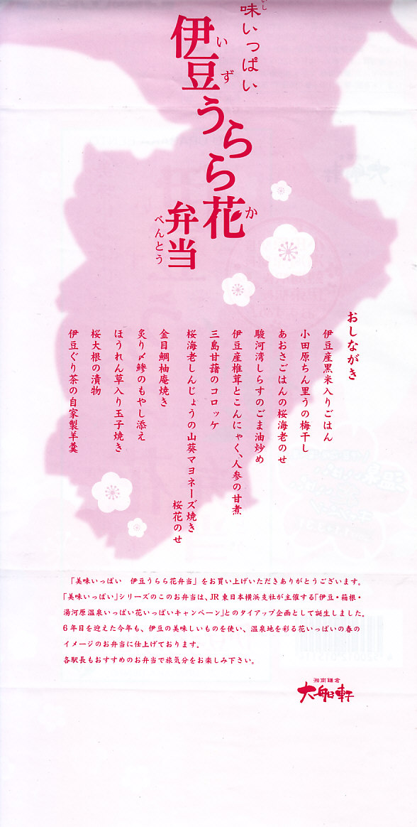 JR東日本横浜支社の観光キャンペーン「伊豆・湯河原温泉いっぱい花いっぱいキャンペーン」の開催に合わせて、2011(平成23)年1月1日から3月31日まで一日30個が、小田原、湯河原、熱海の各駅で販売された期間限定駅弁。調製元は確かに大船駅弁の大船軒であるが、同社はもはや日本レストランエンタプライズ(NRE)の1ブランドであるようで、東華軒のエリアの駅弁売店もNRE化が完了しているため、こんな売り方ができるようになってしまった。