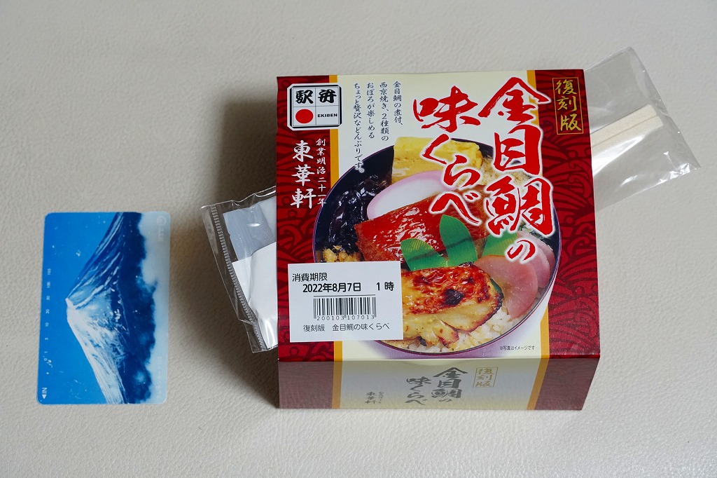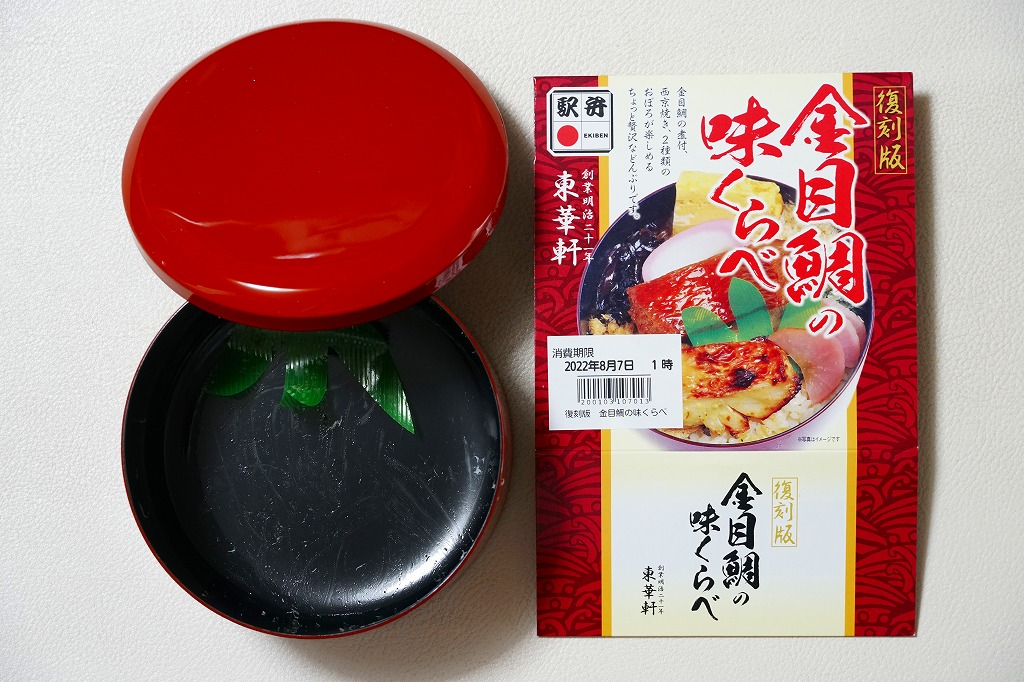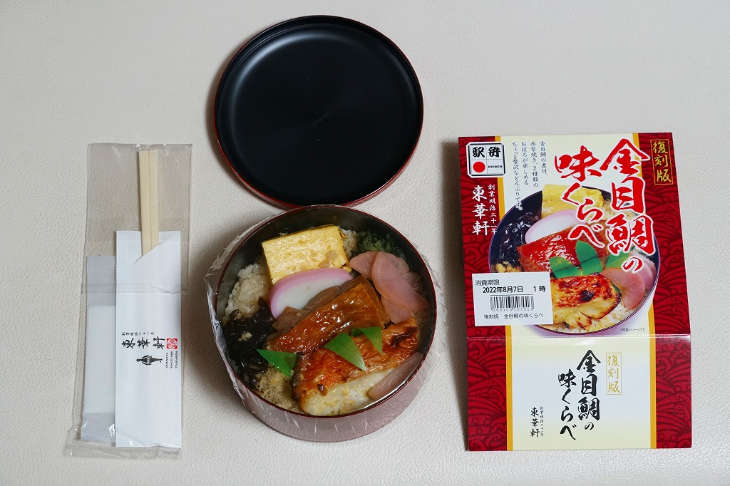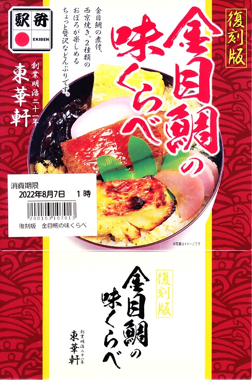 2022(令和4)年8月上旬に東京駅の駅弁売店「駅弁屋 祭」で販売か。調製元や販売元の発表や広報がないので分からないが、どうもこの駅弁売店の10周年を記念した商品のようで、10年前のリニューアルオープン時に存在した駅弁「金目鯛の味くらべ」を復刻したものらしい。商品名と中身の写真でできたスリーブに「復刻版」と書いてある。