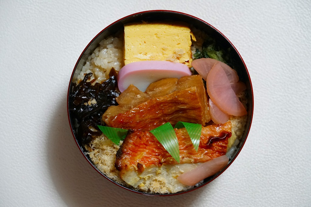 固くて丸いプラ容器に味付け御飯を詰め、キンメダイの煮付けと西京焼きと、みりん味と砂糖味で2種類のおぼろ、玉子焼、昆布佃煮、かまぼこで覆う。商品名と容器と「※レンジ使用不可」の表記を除き、以前と今回で差異がある、復刻版というよりは類似品の新商品という感じ。