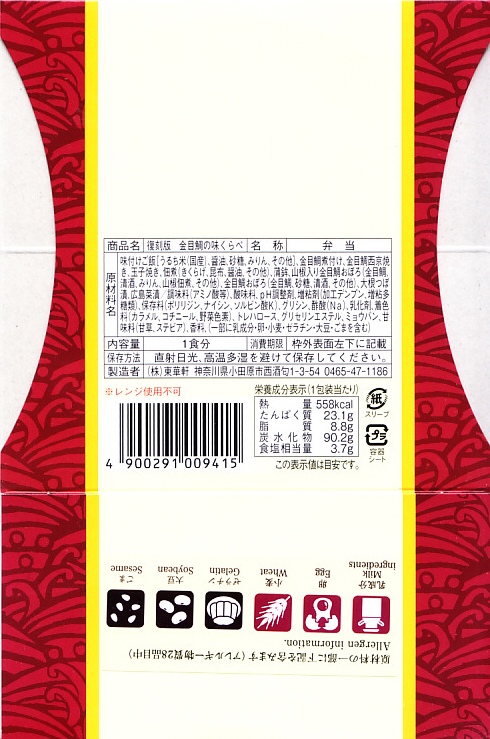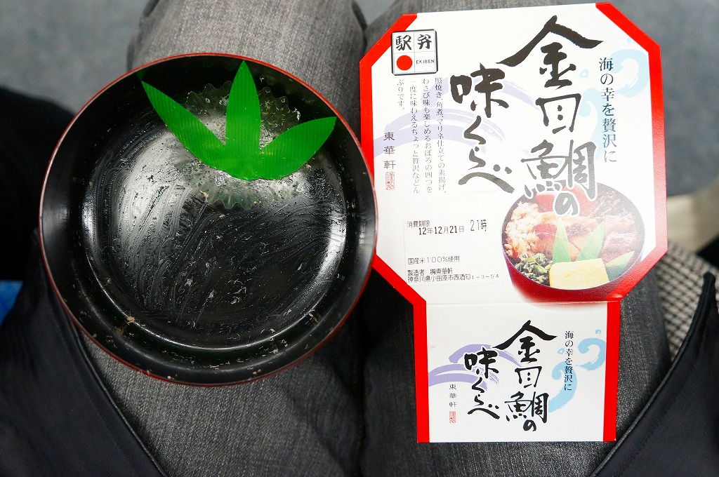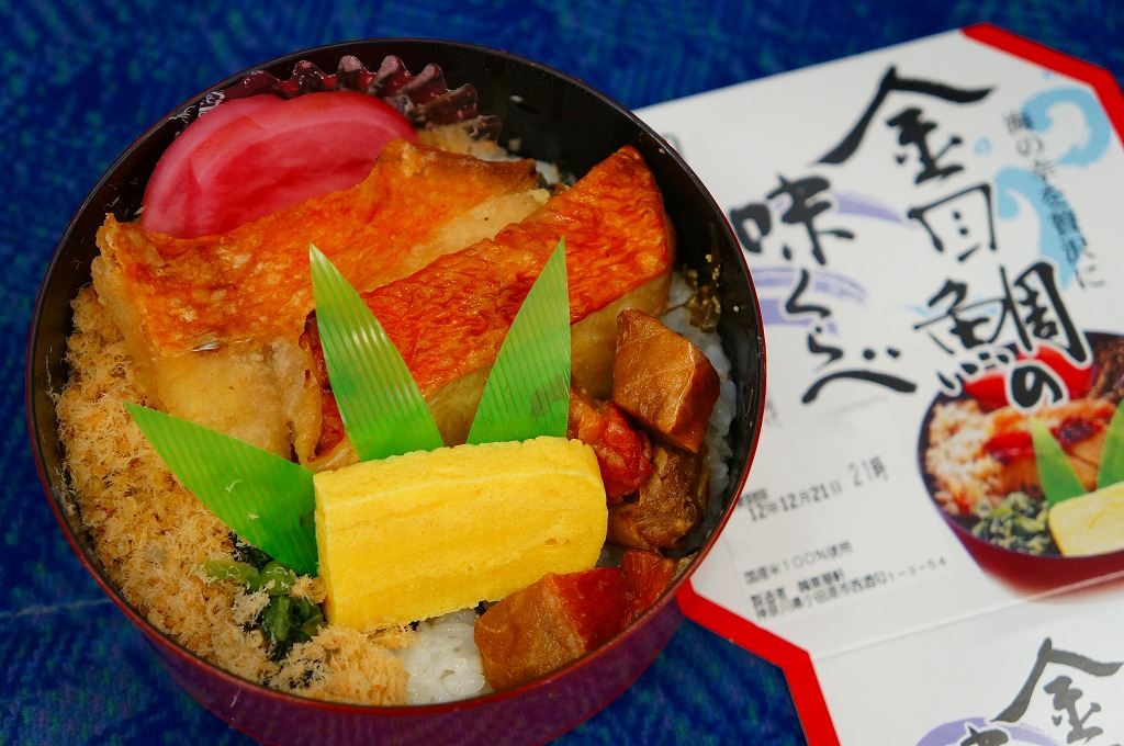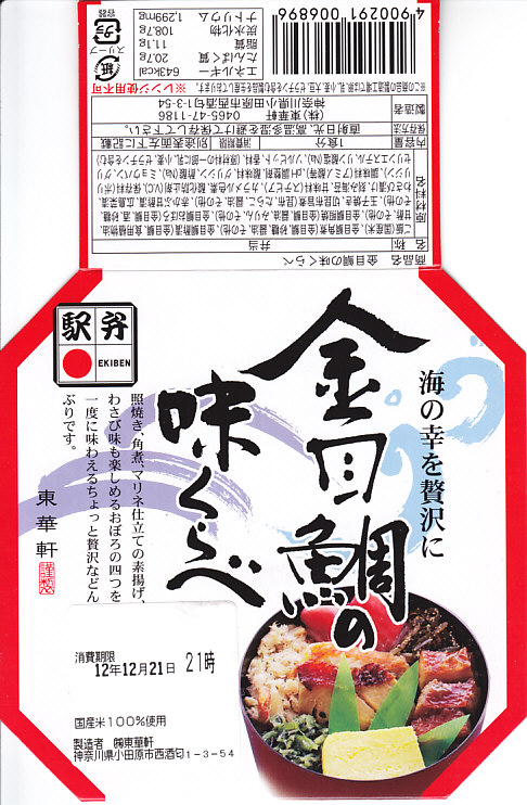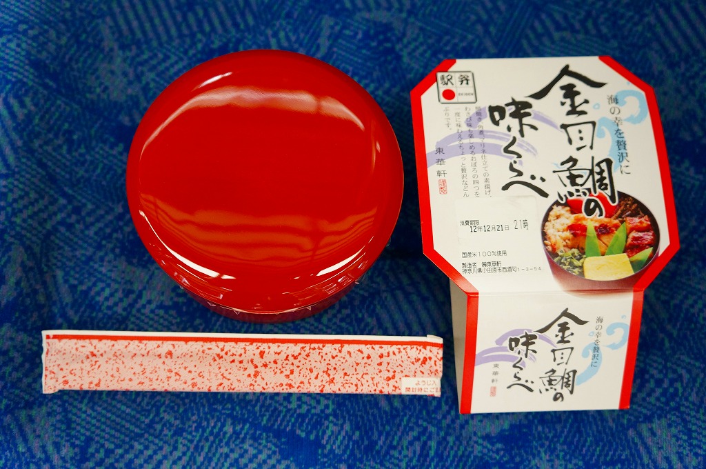 2011(平成23)年の秋までに発売か。調製元は小田原の駅弁屋であるが、この駅弁はどちらかというと熱海駅の駅弁として紹介されることが多い。朱塗りな円形のプラスティック製容器に御飯を詰めて、キンメダイを角煮、マリネというか天ぷら、照焼、フレークというかおぼろの4種のスタイルで載せて、玉子焼、赤カブ漬、広島名漬などを添える。伊豆半島で人気の食材を使い、シンプルでも表情豊かなお味で、現在の熱海駅を代表する駅弁になったのではないかと思う。価格は2012年の購入時で900円、2014年時点で1,000円。2017年までの販売か。