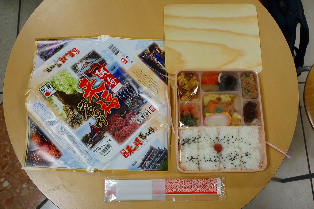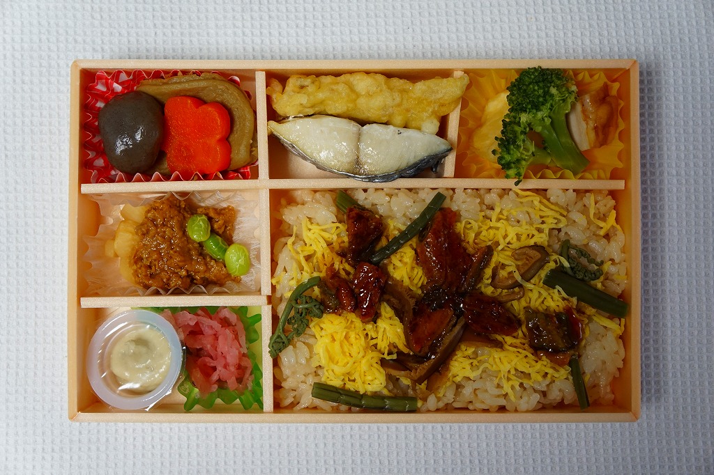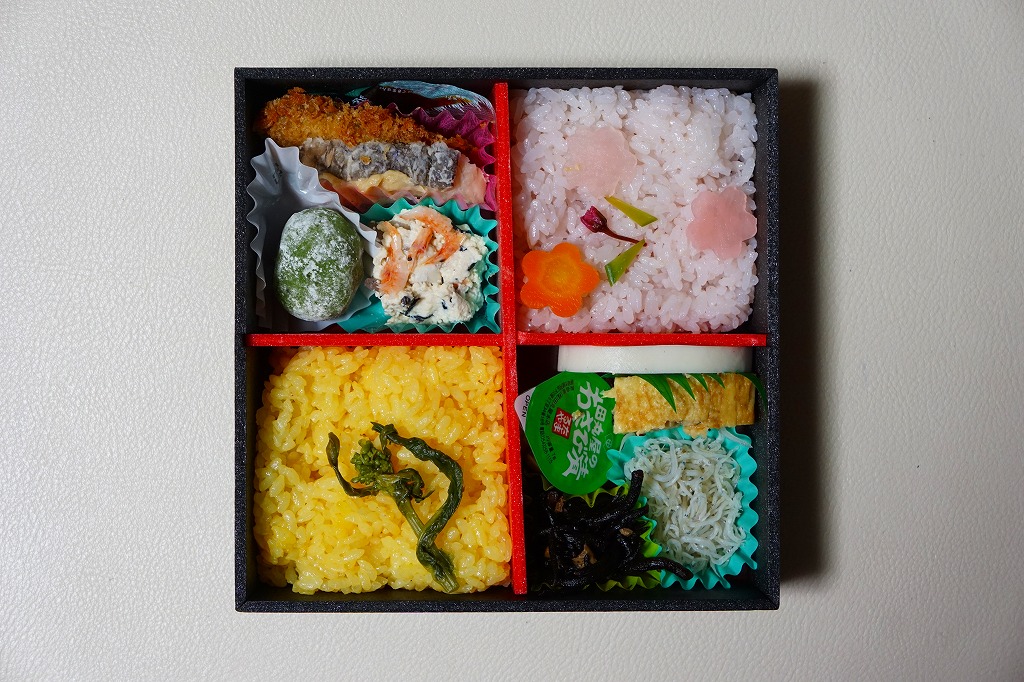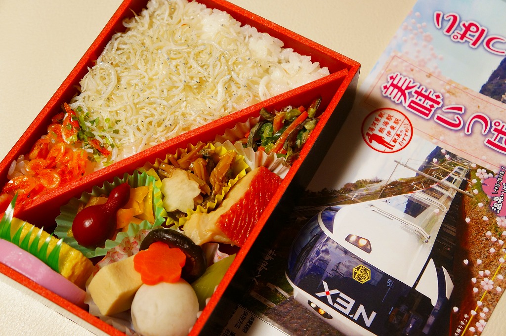 木製重箱柄の容器を二段重ねにして、おしながきを置いたうえで桃色な和紙風の風呂敷で包む。中身は下段がサクラエビの炊込飯、サトイモやタケノコなどの煮物、イチゴと抹茶プリン、上段がキンメダイ幽庵焼、海老しんじょう、有頭海老、玉子焼、厚く白いかまぼこ、しめアジ、牛肉しぐれ煮、菜の花の天ぷらなど。値段が高くないか、とか、これが幕の内弁当なのか、容器と包装が安っぽい、など突っ込みどころはあるけれど、記念駅弁、期間限定駅弁として、中身は好ましくふさわしく食べやすい印象。
