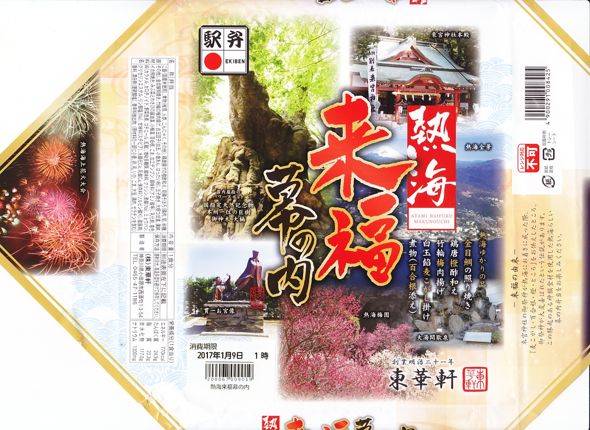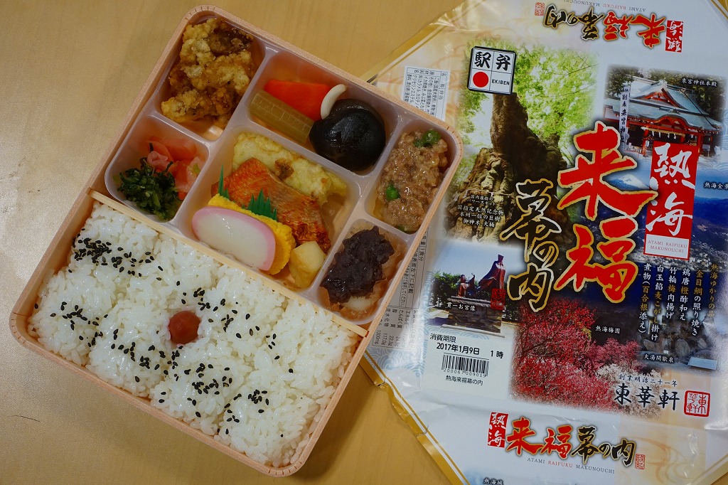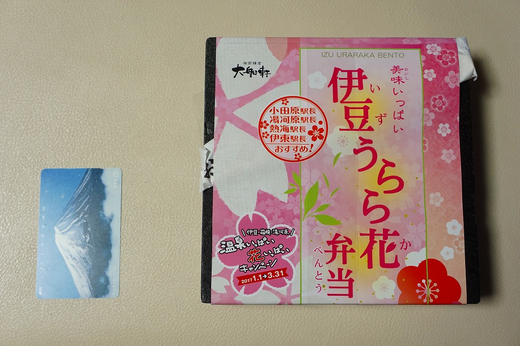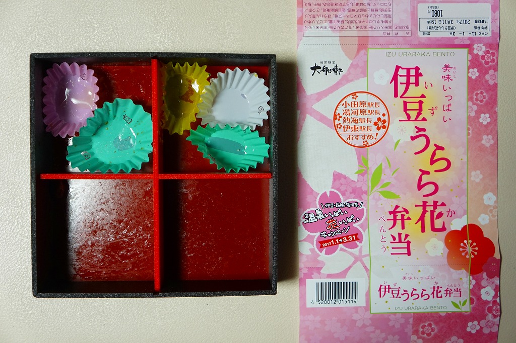 JR東日本横浜支社の観光キャンペーン「伊豆・箱根・湯河原 温泉いっぱい花いっぱいキャンペーン」に伴い、2017(平成29)年1月10日から3月31日まで、熱海駅や大船エリアや東京都内で販売された期間限定駅弁。大船駅弁の大船軒と、横浜駅弁の崎陽軒が、このキャンペーンの駅弁を出したが、小田原駅弁や熱海駅弁の東華軒は出していない。前年と同じなのは、松花堂タイプの容器だけ。桃色の掛紙を巻く真っ黒な容器の中身は、梅干しを載せた黒米入り御飯、サクラエビを載せたあおさ御飯、シラス炒め、サクラエビしんじょう、焼サバともやし、ホウレンソウ入り玉子焼、大根桜漬、キンメダイ焼、こんにゃくとニンジンと椎茸の旨煮、みしまコロッケ、ぐり茶のようかん。
