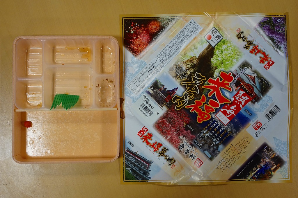 内容は盛り沢山で、風味に問題はないのだが、掛紙の品質とか、容器の柔らかさとか、赤飯や蒲鉾の薄さとか、所々で醸し出される安っぽさが積み重なり、あるタイミングをもって物足りなさが前面に出てくる。そのあたりの完成度は、ここの駅弁屋の駅弁大会対応商品と比べて、なぜか対極にある。