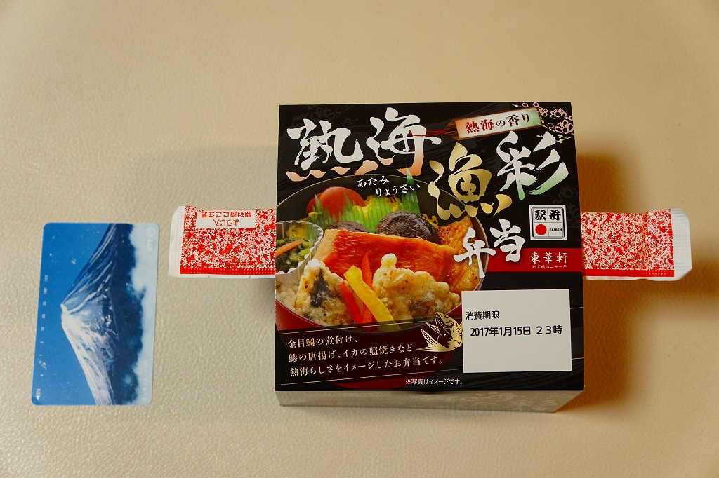 2016(平成28)年12月までに発売か。小田原駅の駅弁屋の商品を東京駅で買ったが、その名前から熱海駅の駅弁ではないかと思う。掛紙には商品名とおしながきを記し、パワースポットの観点での熱海の観光名所の写真を載せる。中身は日の丸俵飯にかまぼこと玉子焼、キンメダイ照焼、鶏唐揚、揚げちくわ、煮物、漬物、白玉、とりそぼろなど。