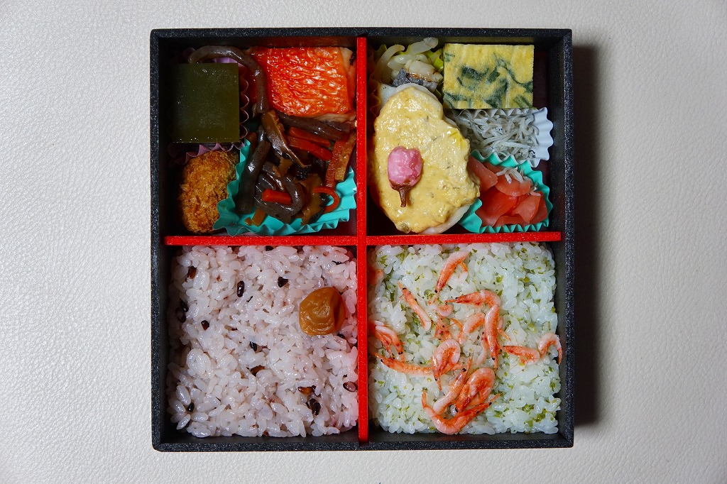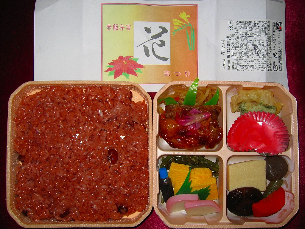 正方形のプラ製の惣菜容器を二段重ねにして、インク式カラープリンタで刷った簡素な掛紙を巻く。中身は下段に色の濃い赤飯を一面に詰め、上段には高野豆腐などの煮物、タラの芽などの天ぷらと大根つぼ漬け、マグロ照焼と鶏照焼と切り干し大根、蒲鉾と玉子焼などを松花堂風に詰める。