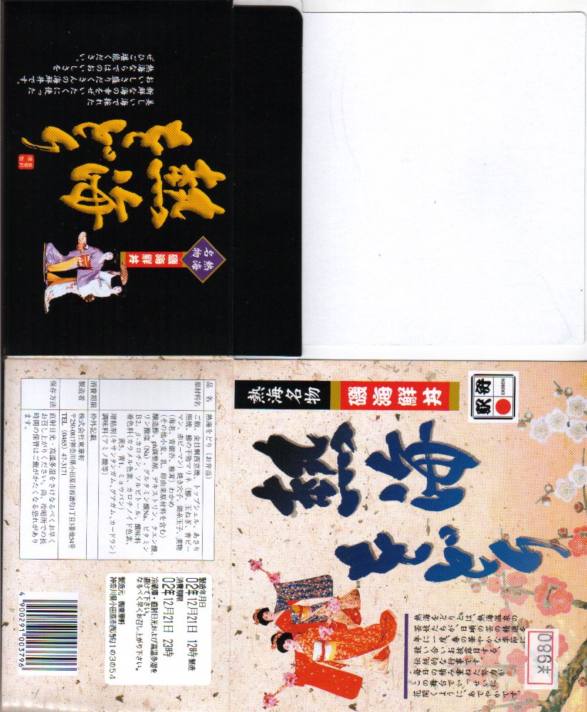 「熱海をどり」は、熱海温泉の芸妓踊り。年に一度芸を競うお披露目会が2002年は4月28,29日に開催されるほか、毎週土日曜の11時から熱海芸妓連歌舞練場で芸妓見番が開催されるそうで、その日時だけがパッケージに記される。