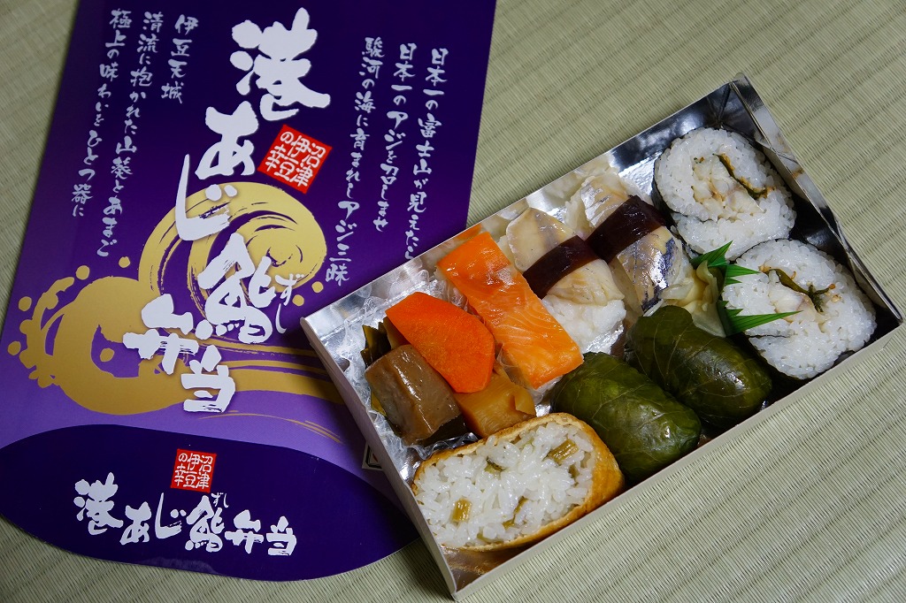 2016(平成28)年11月25日の熱海駅ビル「ラスカ熱海」オープンと同時に発売か。調製元は三島駅や沼津駅の駅弁屋だが、この商品は土休日に熱海駅で売られるという。三島駅や沼津駅で一番人気の駅弁「港あじ鮨」と、とてもよく似た名前とパッケージを使う。