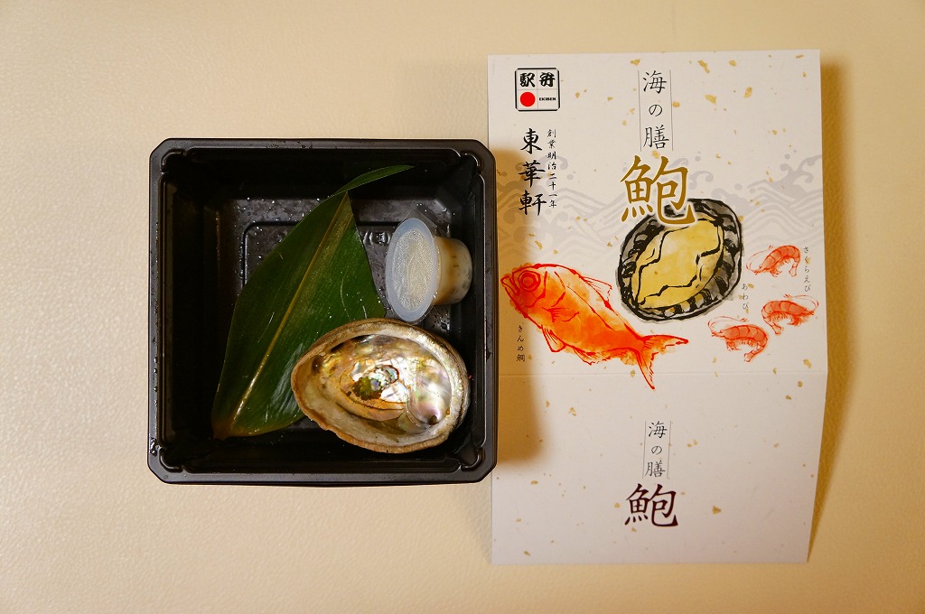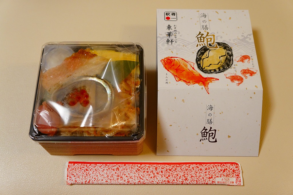 実演販売では、駅弁催事業者のスタッフが調製も販売も担当。食べた感じでは、たっぷりジューシーなサクラエビ、色濃くも臭みや変な固さのない都会的なアワビ、小田原駅弁でも味の良いキンメダイ焼などと、風味は良好。しかし悪かったのは、催事場での立地か、価格か内容か、客がまったく付いておらず気の毒だった。