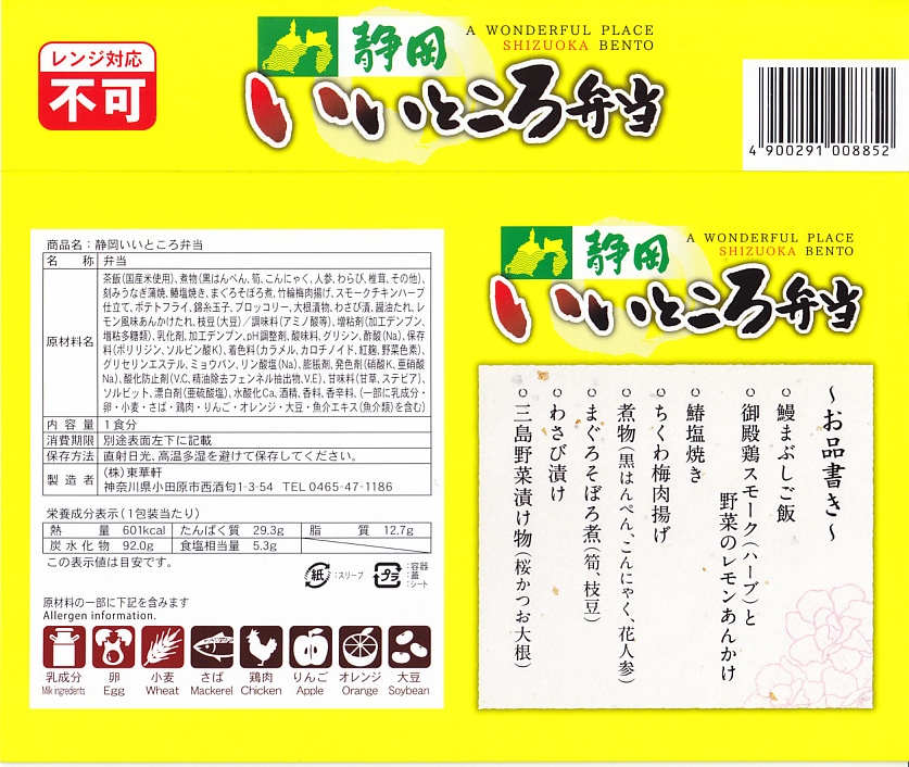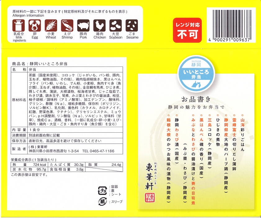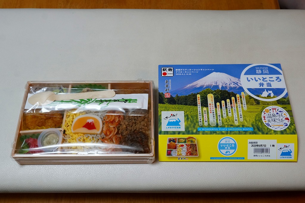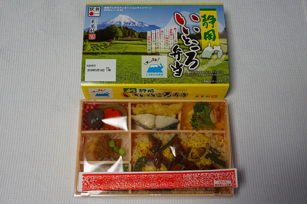 2019年4月から6月までのJRグループの観光キャンペーン「静岡デスティネーションキャンペーン」の実施に向けて、その1年前を「プレキャンペーン」と位置づけ、2018(平成30)年4月から6月までの販売。調製元は神奈川県は小田原駅の駅弁屋だが、昭和時代から熱海駅の駅弁屋でもあり、熱海は静岡県なので、こうやって静岡の駅弁を作って売る。