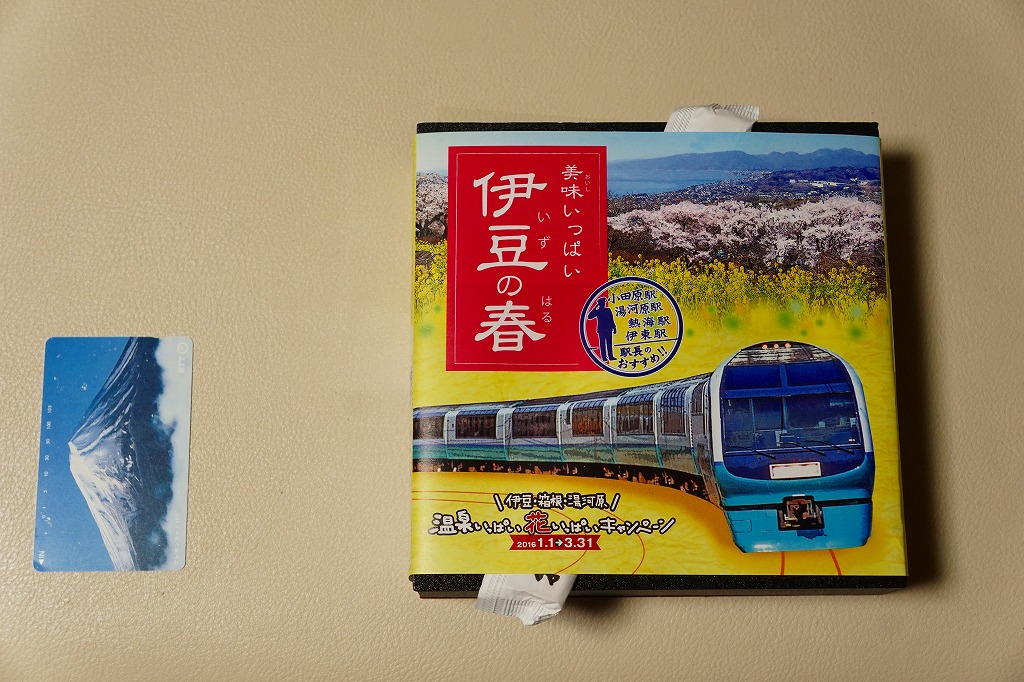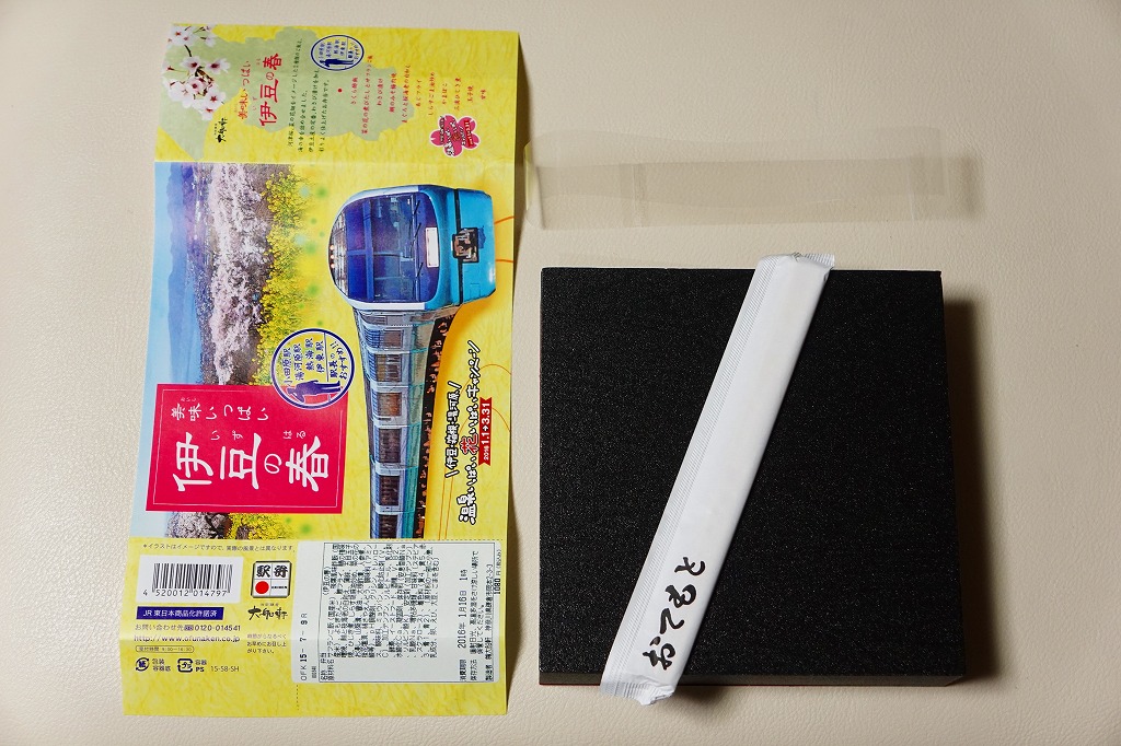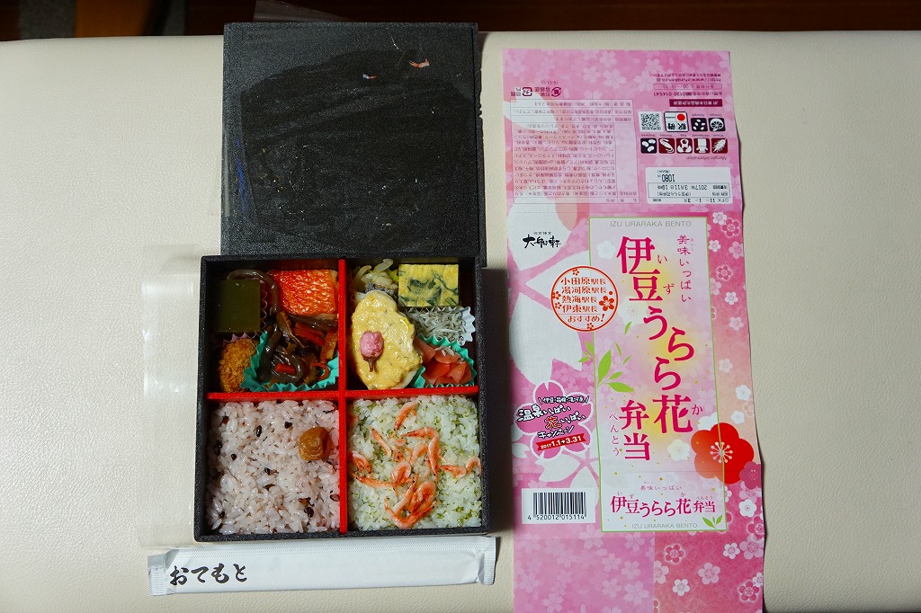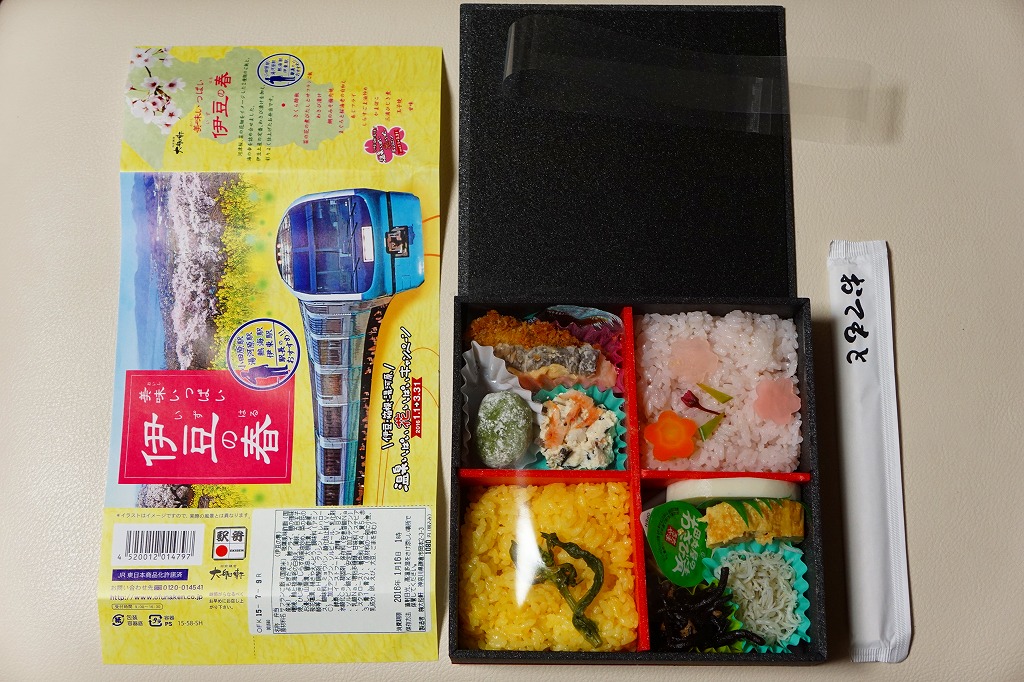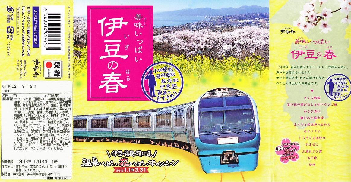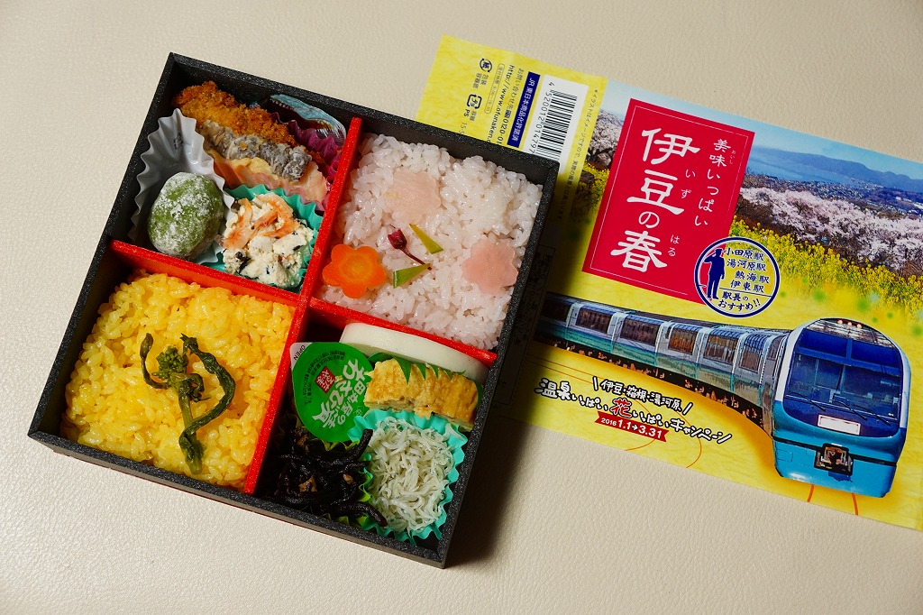 JR東日本横浜支社の観光キャンペーン「伊豆・湯河原 温泉いっぱい 花いっぱいキャンペーン」に伴い、2016(平成28)年1月10日から3月31日まで、熱海駅や大船エリアや東京都内で販売された期間限定駅弁。熱海駅の駅弁とされるが、調製元は大船駅の駅弁屋である大船軒。松花堂の4区画に収めた今回の中身は、サフランライス、サクラ酢飯、玉子焼と蒲鉾とシラスとひじきとわさび漬カップ、アジフライとタイ味噌焼とマグロ和えとよもぎ団子だった。