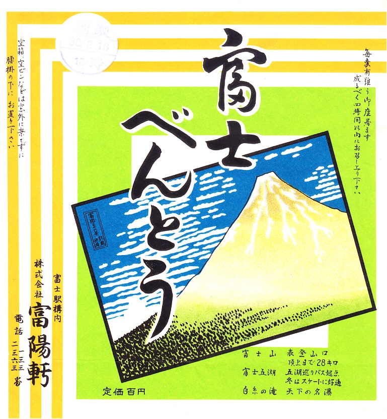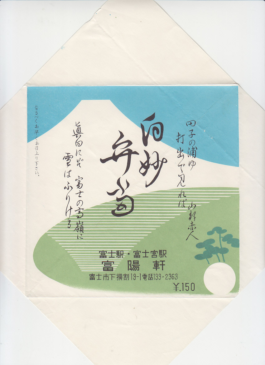 1963(昭和38)年2月16日12時の調製と思われる、昔の富士駅弁の掛紙。並等の幕の内駅弁。富士駅だから富士べんとうか、富士山にあやかったものか。掛紙には当然に富士山が描かれる。