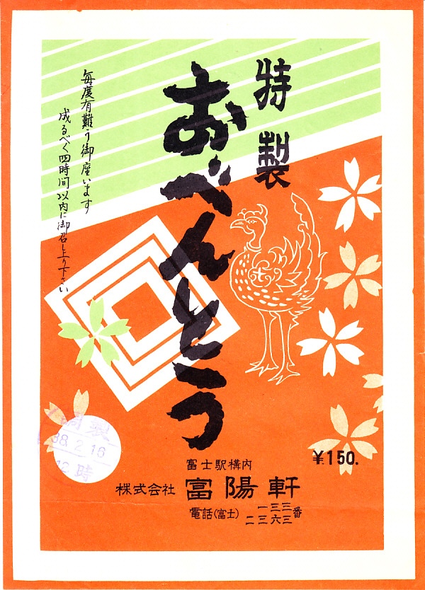 1963(昭和38)年2月16日12時の調製と思われる、昔の富士駅弁の掛紙。当時の上等幕の内駅弁だろう。この日付の富士駅弁の掛紙は、4種5枚をまとめて入手。これらと「三味おにぎり」(100円)で、当時の富士駅弁のすべてであると思われる。売店で駅弁をすべてひとつずつ買い求める駅弁マニアが、当時にもいたということか。