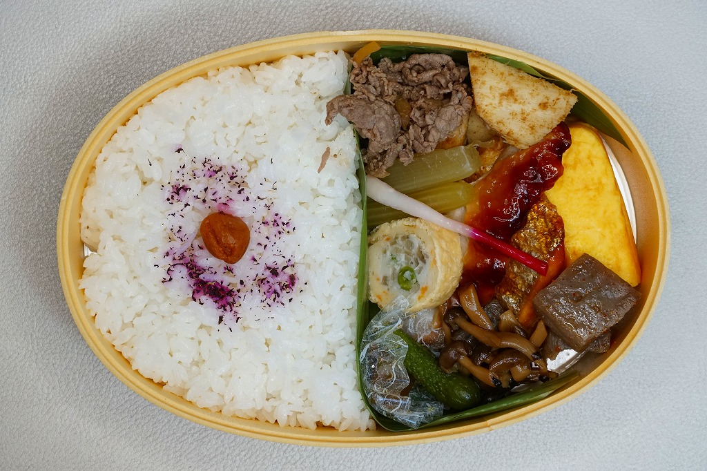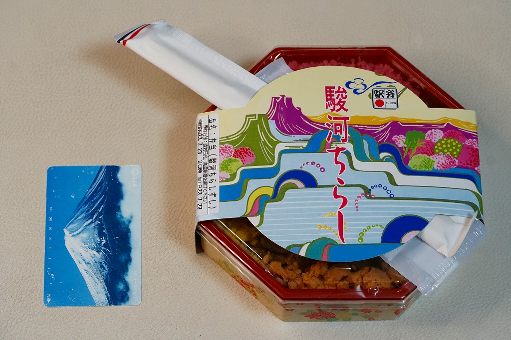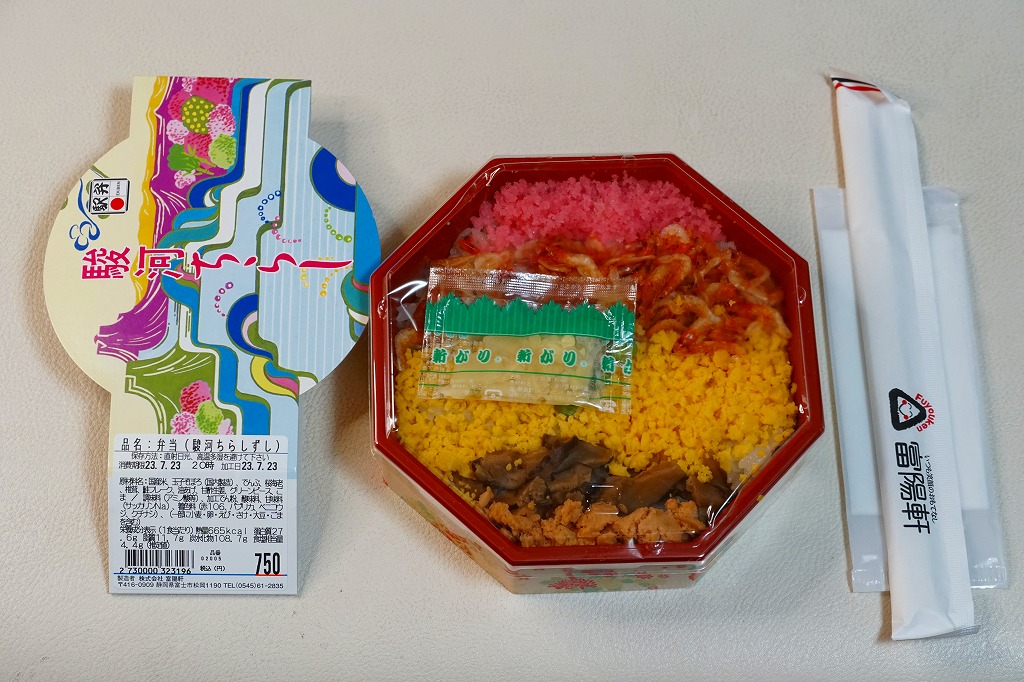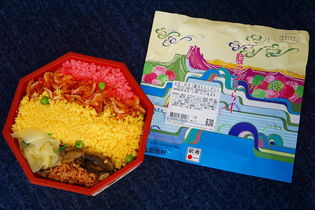 2004(平成16)年頃に630円で発売か。富士山とその他の山並みでデザインしたようなスリーブにはめる、正八角形の容器に白飯を敷き、桜でんぶ、サクラエビ、炒り卵、刻みシイタケ、鮭フレーク覆う。具は散らさず、真横にストライプ。サクラエビを入れるだけで駿河を表現できて便利だなと思った。長らく変わらなかった価格は、2019年5月から750円、2025年4月から840円。