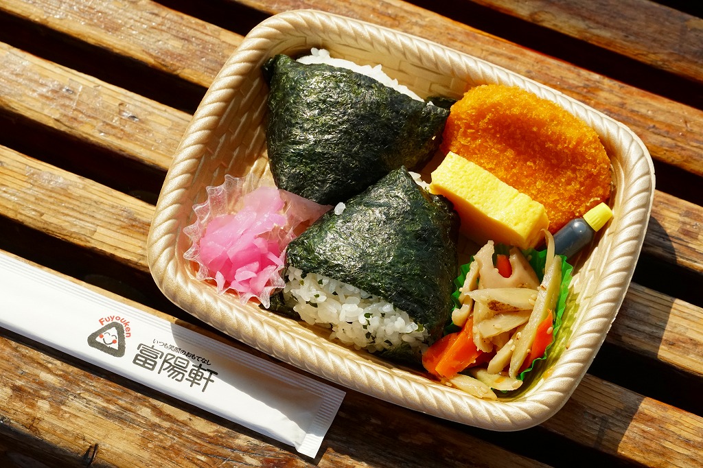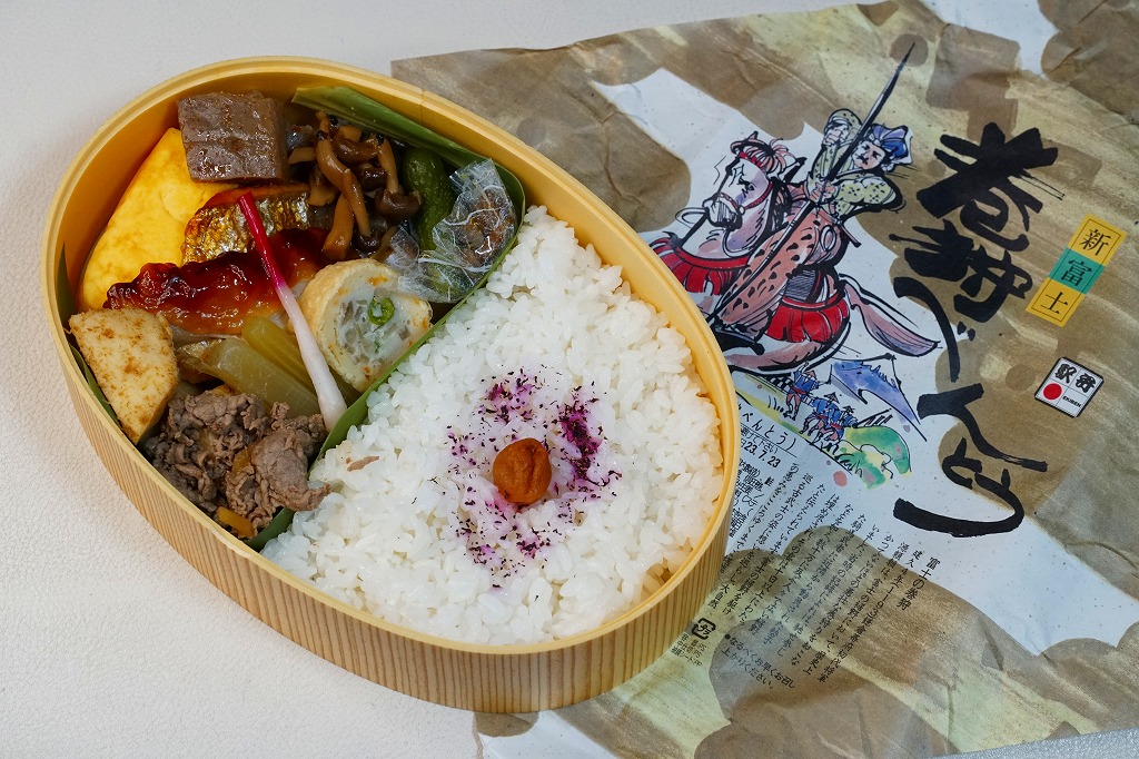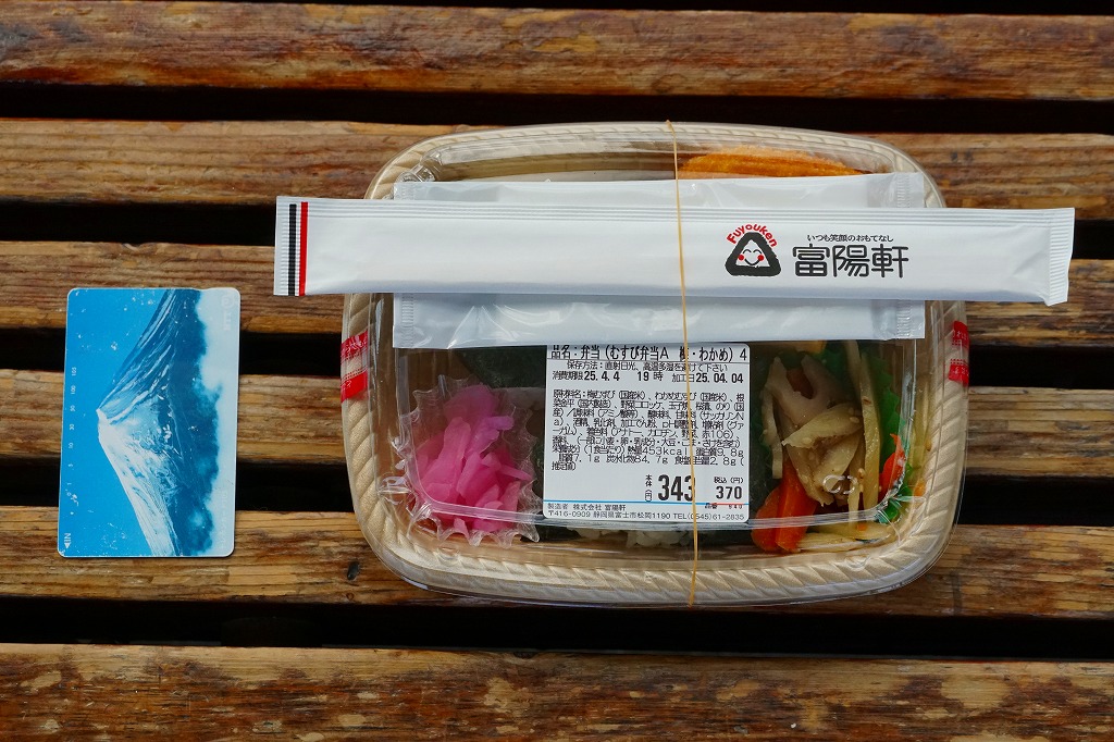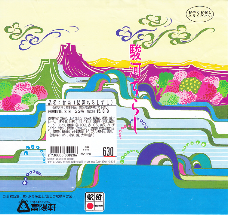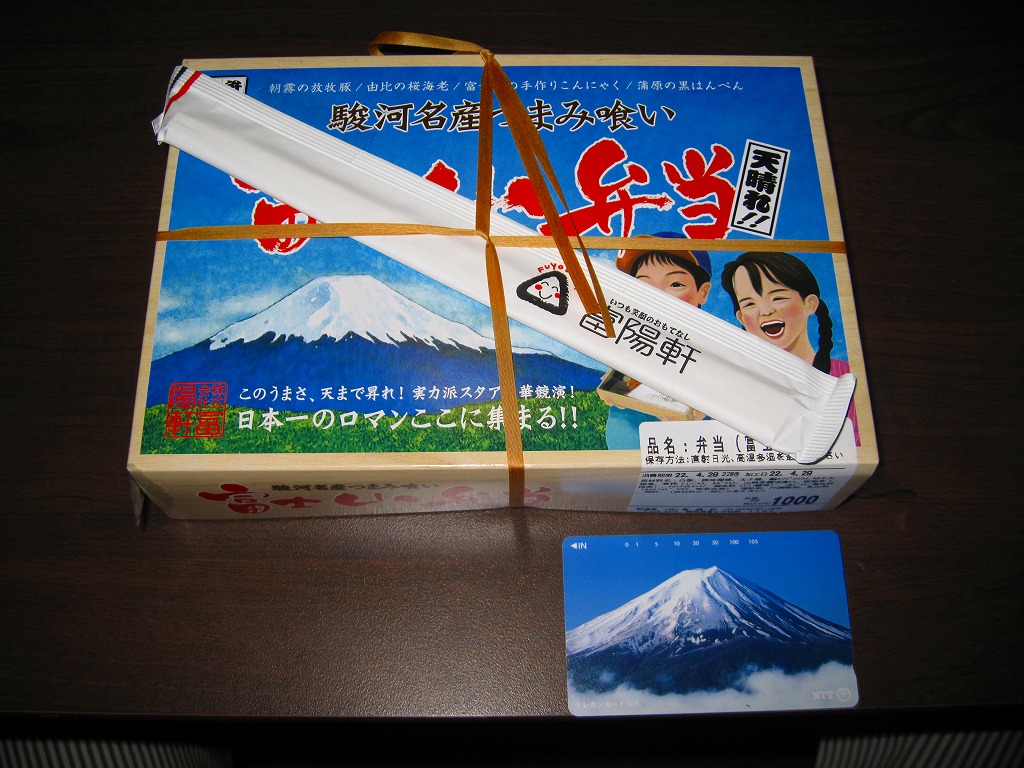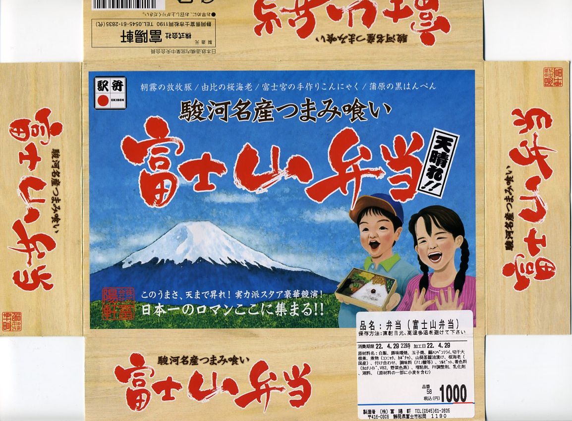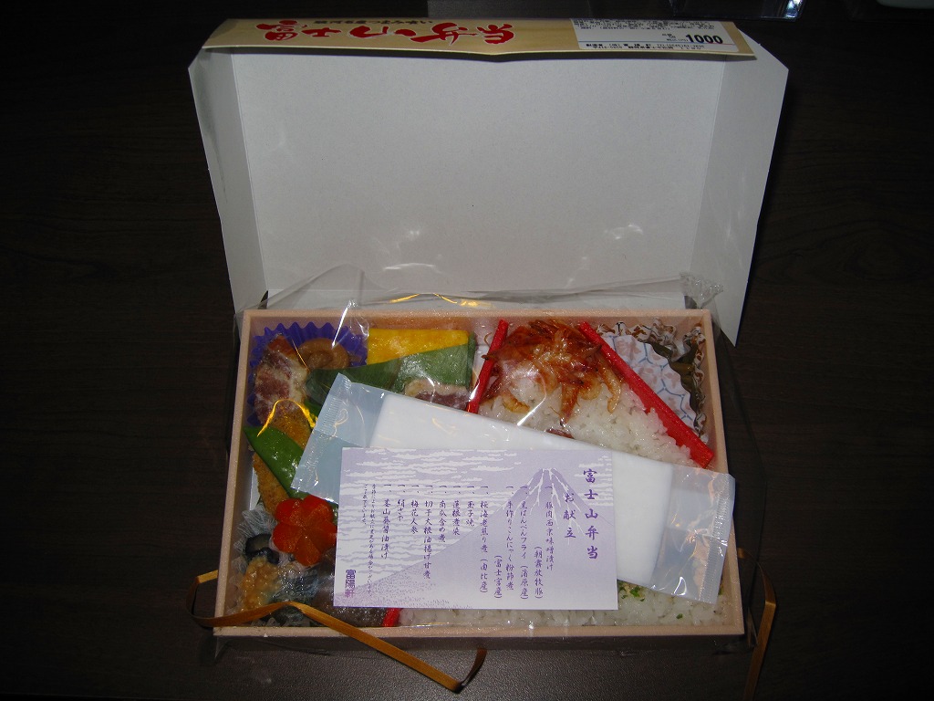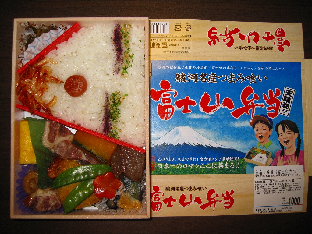 2008(平成20)年1月頃の発売。通常は新富士駅でのみ販売される駅弁。長方形の容器に、昭和中期の漫画の雰囲気を狙ったと思う絵柄のボール紙でふたをする。中身はサクラエビなどで彩る日の丸御飯に、豚肉西京味噌漬、黒はんぺんフライ、玉子焼、こんにゃくやカボチャなどの煮物、茎ワサビなど。富士山周辺の名産品を少しずつ詰めたのだという。副菜がことごとくスパイシーで、個人的には食べるのに難儀した。価格は購入時で1,000円、2014年4月の消費税率改定で1,030円。2016年頃か2019年までの販売か。