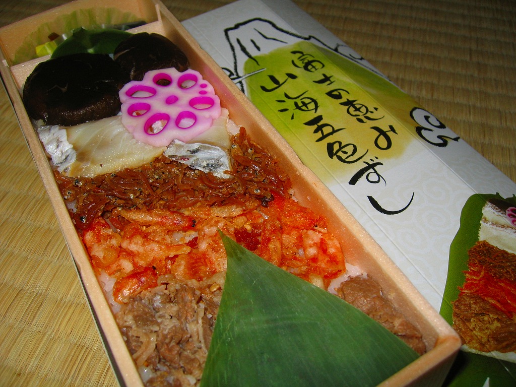 秋冬の駅弁大会シーズンに向けた、2006(平成18)年10月発売の新商品。細長い長方形の容器を、蒲鉾型のボール紙に収納する。中身は笹の葉を敷いたゴマ入り酢飯の上に牛肉甘辛煮、桜海老バラ揚げ、じゃこ山椒煮、鯛の酢締めと花蓮根酢漬、椎茸の含め煮を順番に並べて、茎わさびを添える。