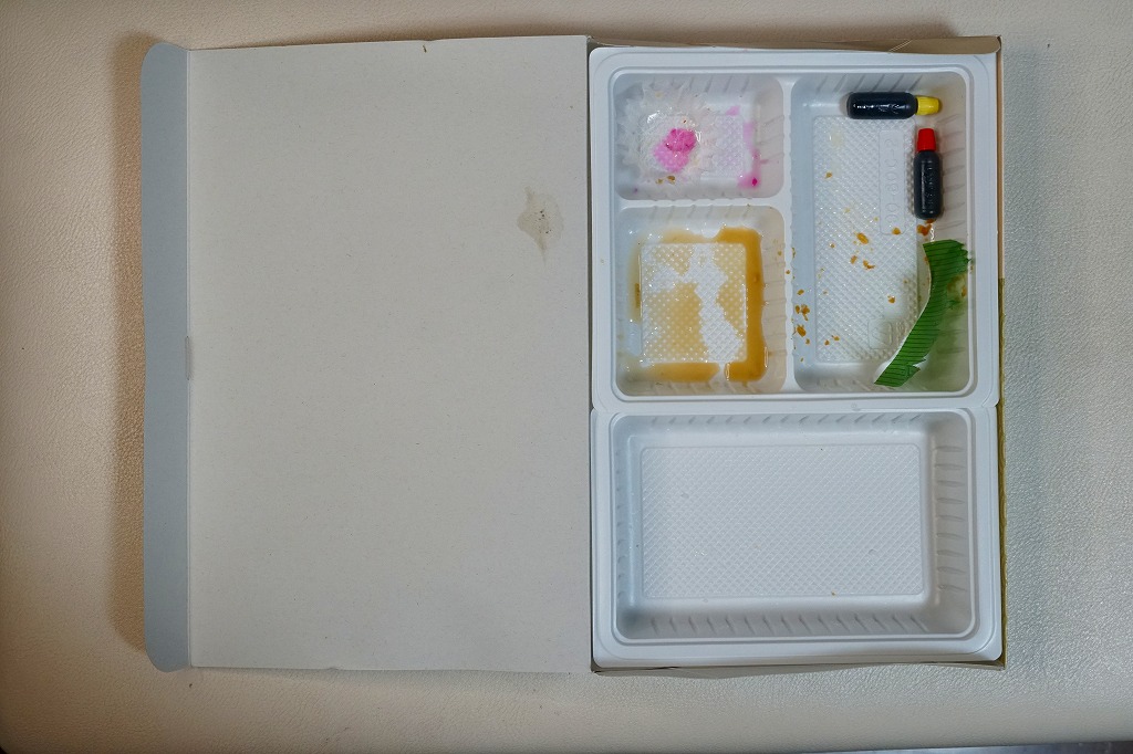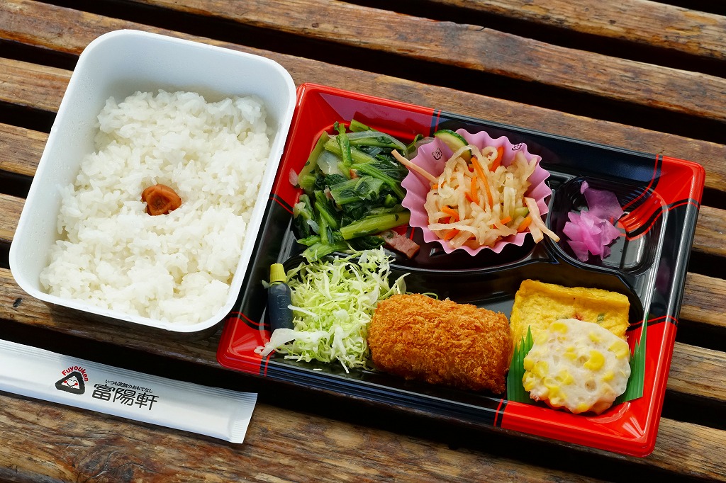 平日のみ営業する新富士駅の駅弁売店で買えたお弁当。売店では「日替り弁当 ¥580(税込)」の値札が付いていた。日の丸御飯を詰めた発泡材の容器と、クリームコロッケ、玉子焼、コーンさつま揚げ、キャベツ千切り、小松菜とベーコンの炒め物、切り干し大根、大根桜漬を詰めた平たいプラ容器の組合せ。それぞれに「200円」「380円」の値札が付いており、惣菜を駅弁売店でセット売りしたのだろう。暖かくはない。見た目に加えて風味も、スーパーの惣菜といった感じだった。