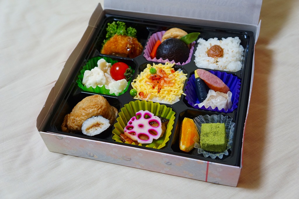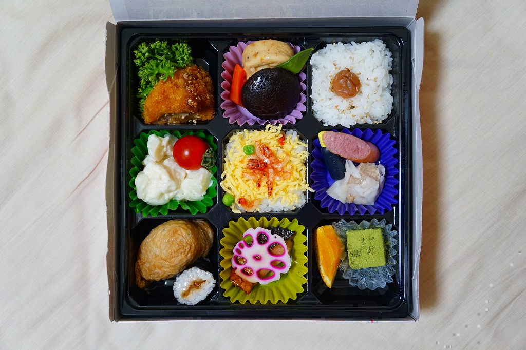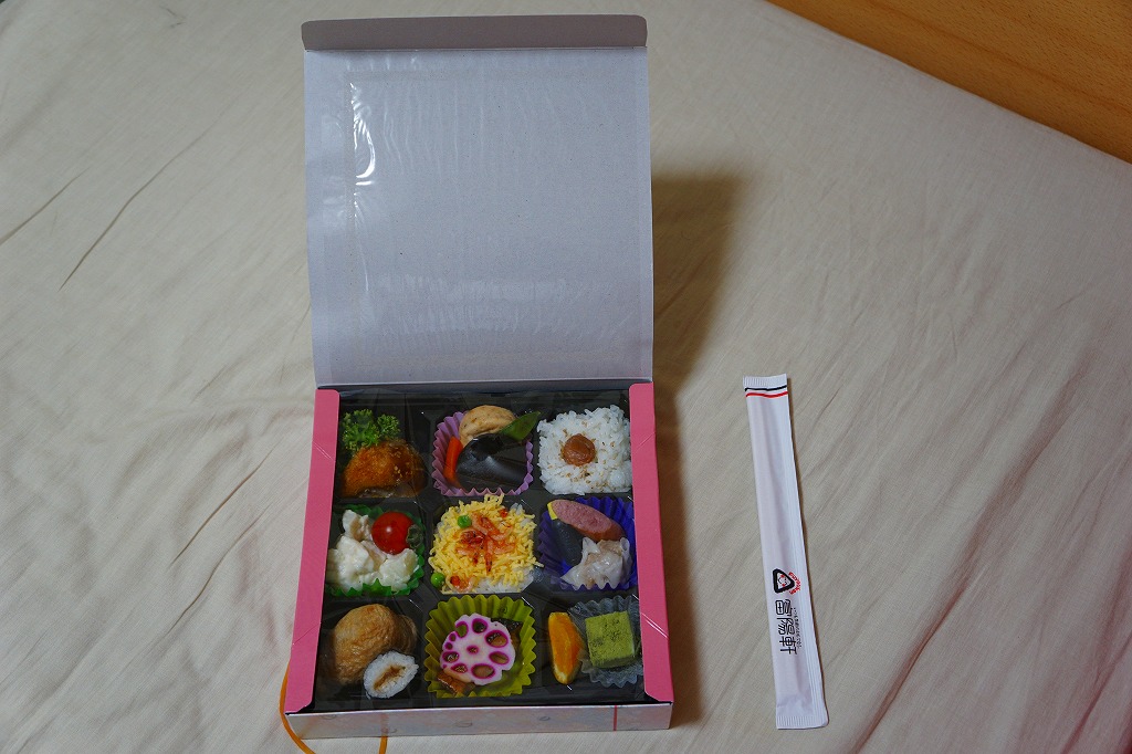 富士駅や新富士駅の、並等の幕の内駅弁。市販の仕出し弁当向けボール紙箱で、9区画のプラ製トレーに収まる中身は、日の丸御飯、サクラエビ載せ御飯、おいなりさんとかんぴょう巻、鶏カツ、サバ照焼、煮物、ポテトサラダ、しゅうまいとウインナー、オレンジと抹茶わらび餅。富士のある内容で、おつまみ向け。食事としては100円追加して幕の内弁当を買うのがよいと思った。2019年時点で現存しない模様。
