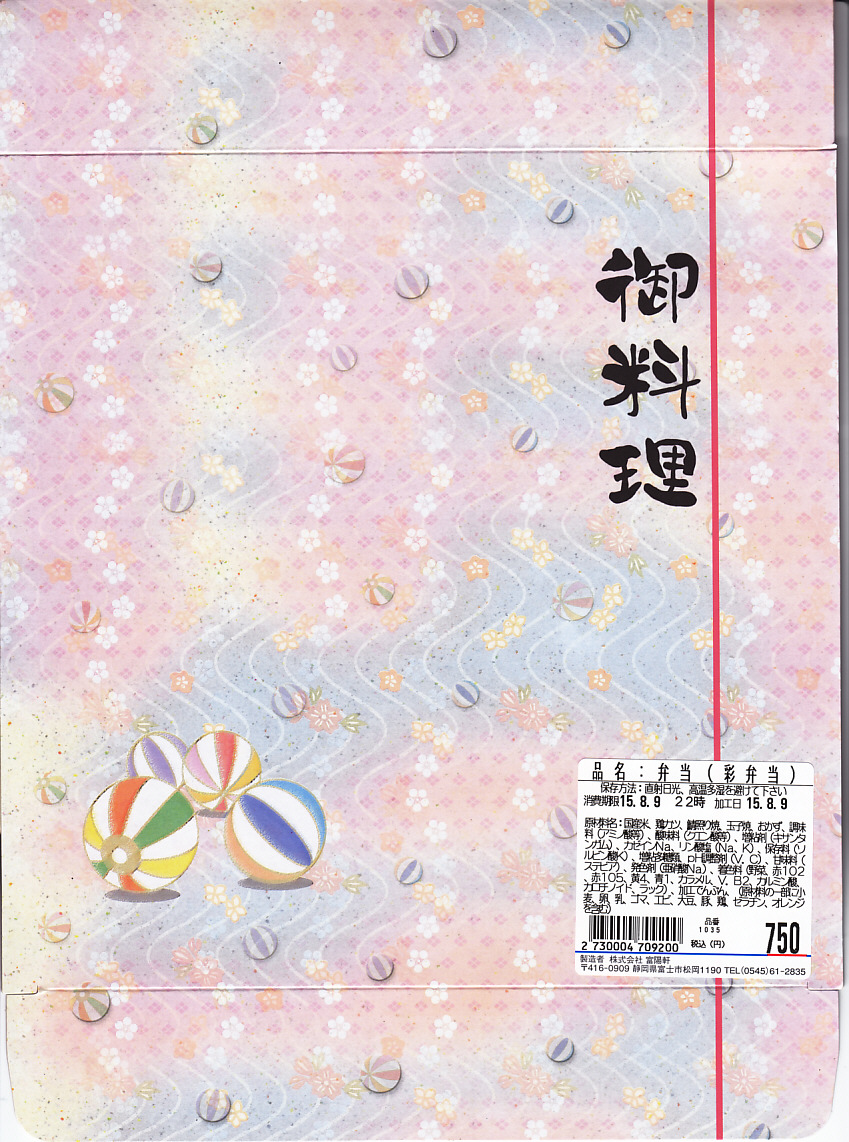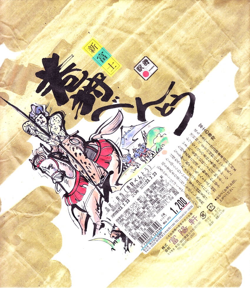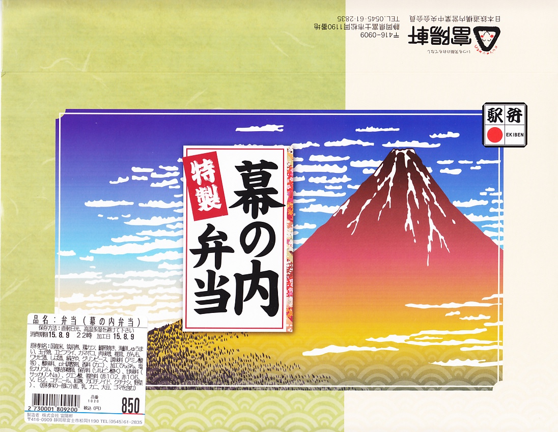 2015(平成27)年8月9日に購入した、新富士駅弁の掛紙。当時はスリーブでなく掛紙を使っていた。それと価格以外は、2023年のものと同じ。2004年頃の発売時から変わらないかもしれない。