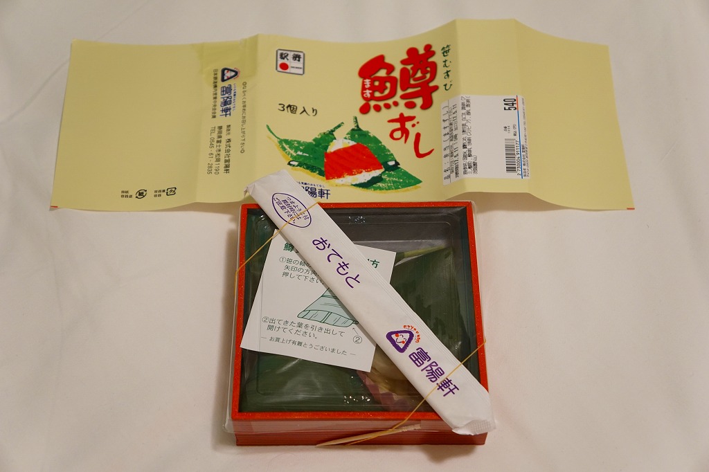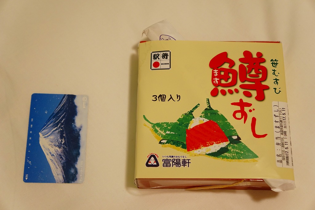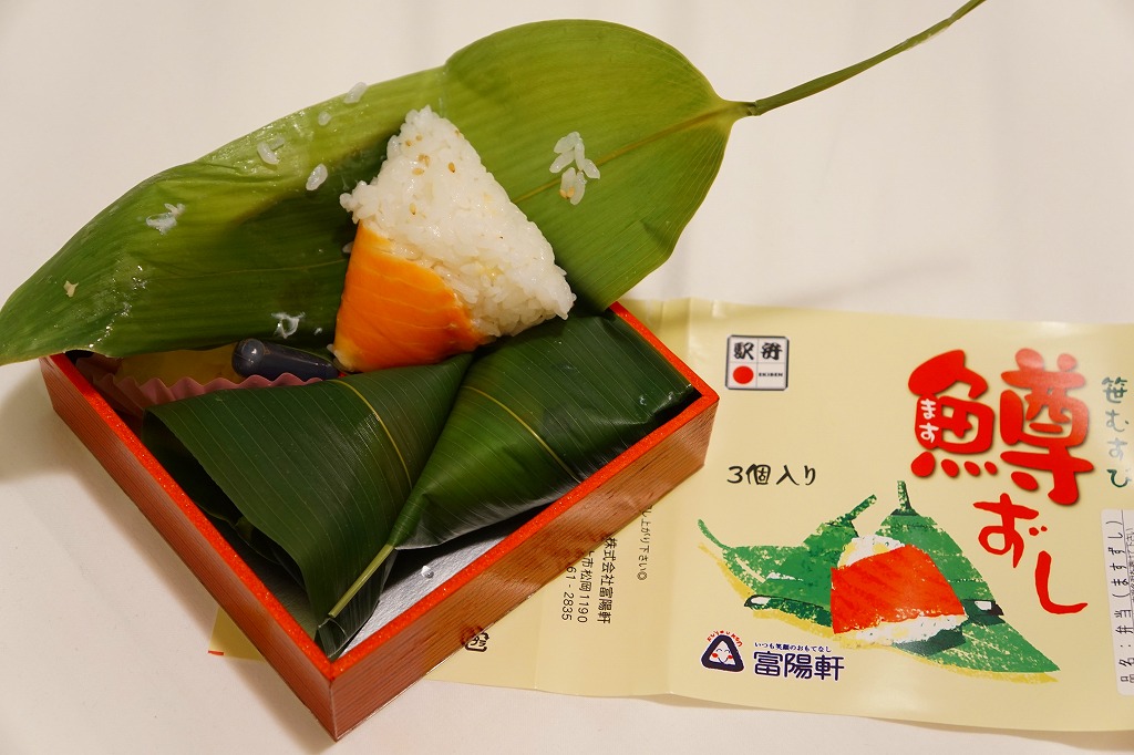 上記の駅弁「笹むすび鱒ずし」の、3個入りバージョン。名前は「鱒ずし3個入」とも。中身は同じだが、容器もパッケージの絵柄もまるで異なる。値段は2017年の購入時で540円、2019年5月から650円。2020年頃までの販売か。