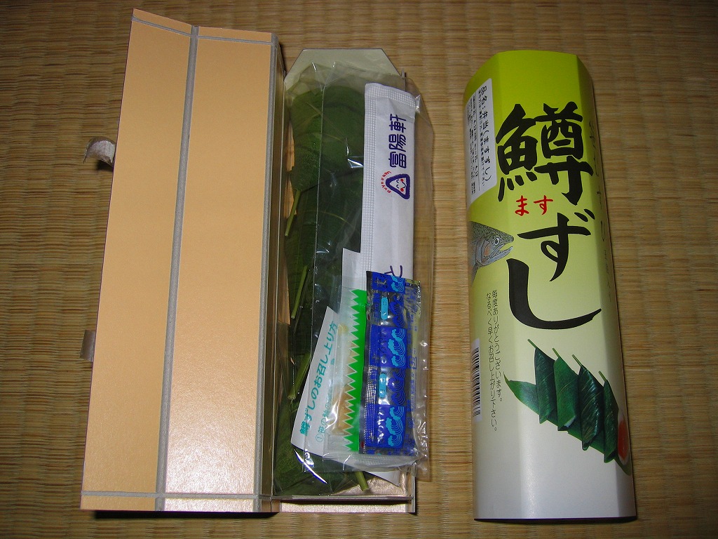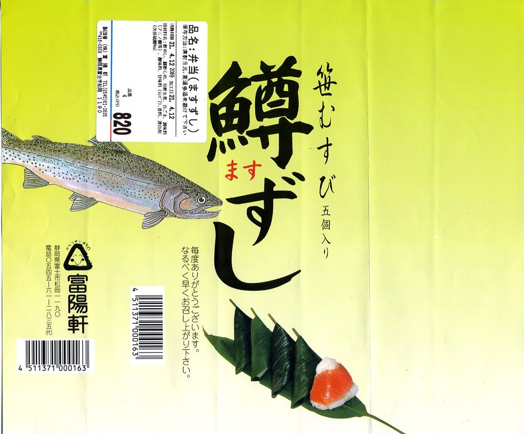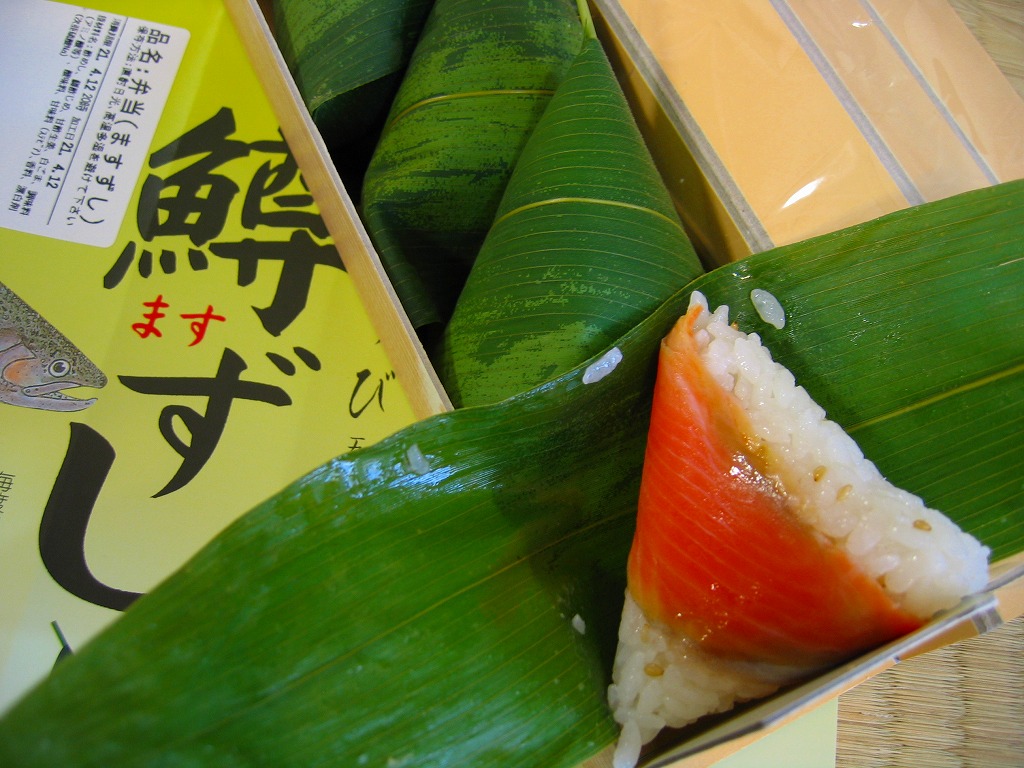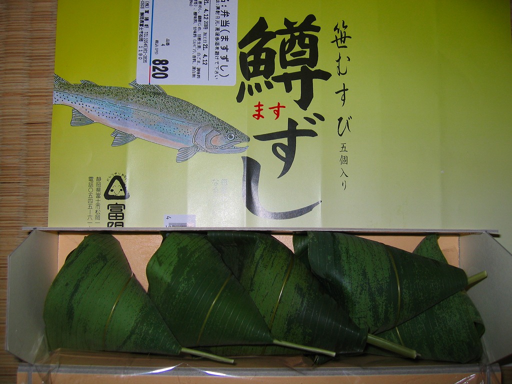 ほとんど筒状の頑丈なボール紙製の容器に、商品名と中身写真とマスのイラストを描いた掛紙を巻き付ける。容器の中には笹むすびが5個入り、そのひとつひとつに三角形の白ゴマ入り酢飯とマスが詰まっている。持ち歩きやすく食べにくく、味はなかなか。マス寿司といえば富山の代名詞であるが、東海道本線沿線のものも乙なところが揃っている。2019年時点でこの5個入りは現存しない模様。