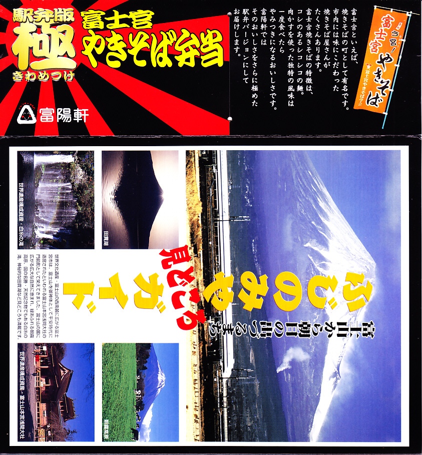 2005(平成17)年11月14日に、新富士駅と富士宮駅で発売。史上初のやきそば駅弁だという。四角い加熱機能付き容器を収めたスリーブには、中身の写真や商品名に富士山や波浪や具材などをど派手に描く。中身は海老やホタテやイカや錦糸卵を載せた、豚肉とキャベツ入りの富士宮やきそば、山葵ご飯、牛肉しぐれ煮、わさび茎、イワシの削り節、紅生姜。