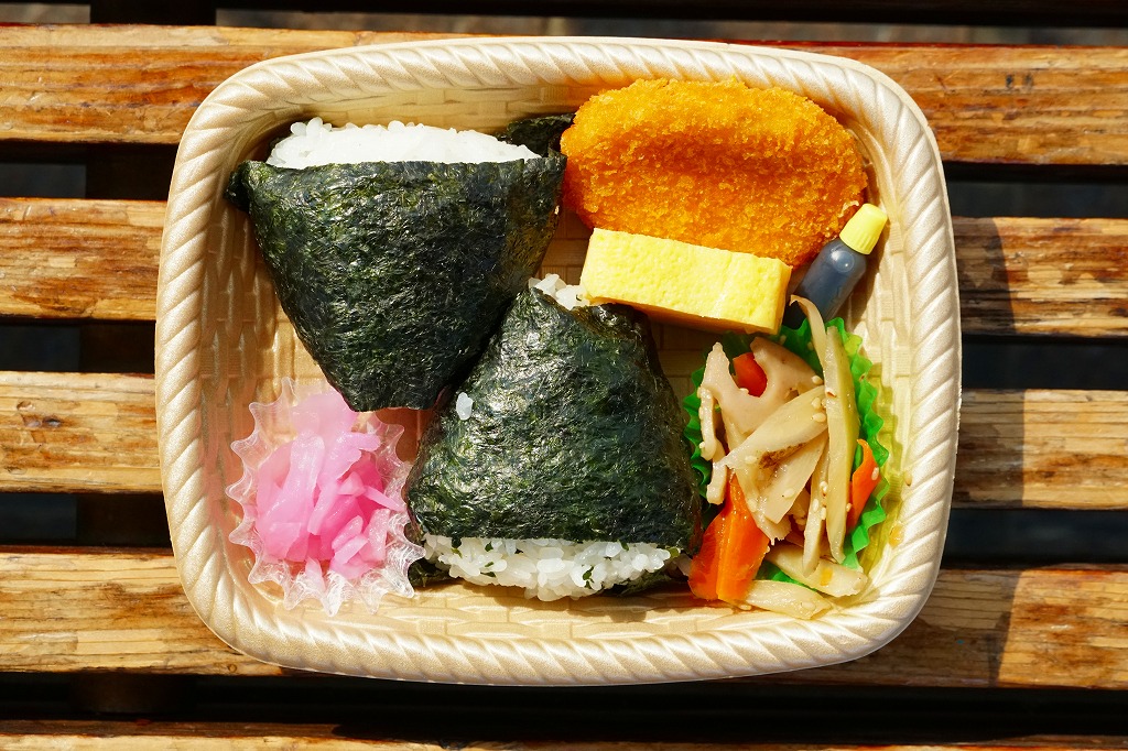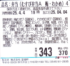 平日のみ営業する新富士駅の駅弁売店で買えたお弁当。売店では「むすび弁当 370円(税込)」の値札が付き、食品表示ラベルには「弁当(むすび弁当A 梅・わかめ)4」の品名が付く。編み籠のような模様が付くプラ容器に、梅干しを入れたおにぎり、わかめの混ぜご飯のおにぎり、コロッケ、玉子焼き、れんこんとにんじんのきんぴら、大根桜漬を詰めていた。