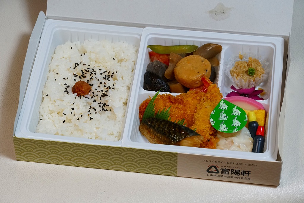 富士駅や新富士駅の、普通の幕の内駅弁。赤富士を描いた専用のボール紙箱に、日の丸御飯の白いプラ製トレーと、鶏カツ、サバ照焼、エビフライ、しゅうまい、玉子焼、かまぼこ、筑前煮、しば漬、わさび漬などを詰めるプラ製トレーを収める。駅弁として控えめな価格で、具の量と種類を確保した、食材や調理での地域性はない、弁当の実需がある新幹線駅らしい食事向け駅弁。価格は2010年時点で840円、2015年時点で850円、2019年5月から880円、2023年11月から950円、2025年4月から1,000円。