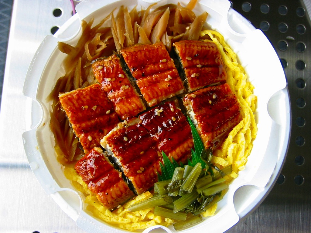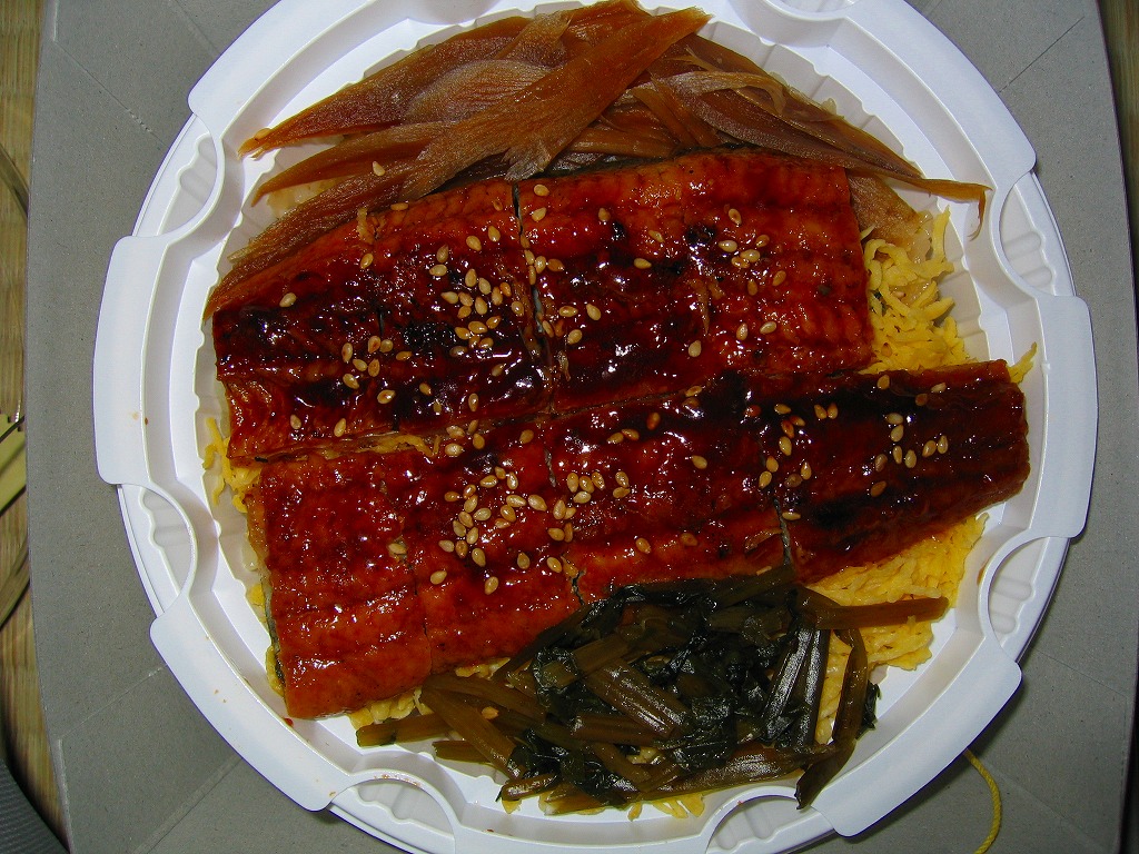 2002(平成14)年頃に発売か。丸い加熱機能付き容器を薄手のボール紙箱に入れる。中身はかなり水気の多い醤油飯の上に錦糸卵と笹掻きゴボウを敷いて鰻蒲焼を2切れ載せるもので、冷めた状態だと食べられたものではないが、暖めれば中身のすべてが柔らかく消化が良さそうな感じに変貌する。