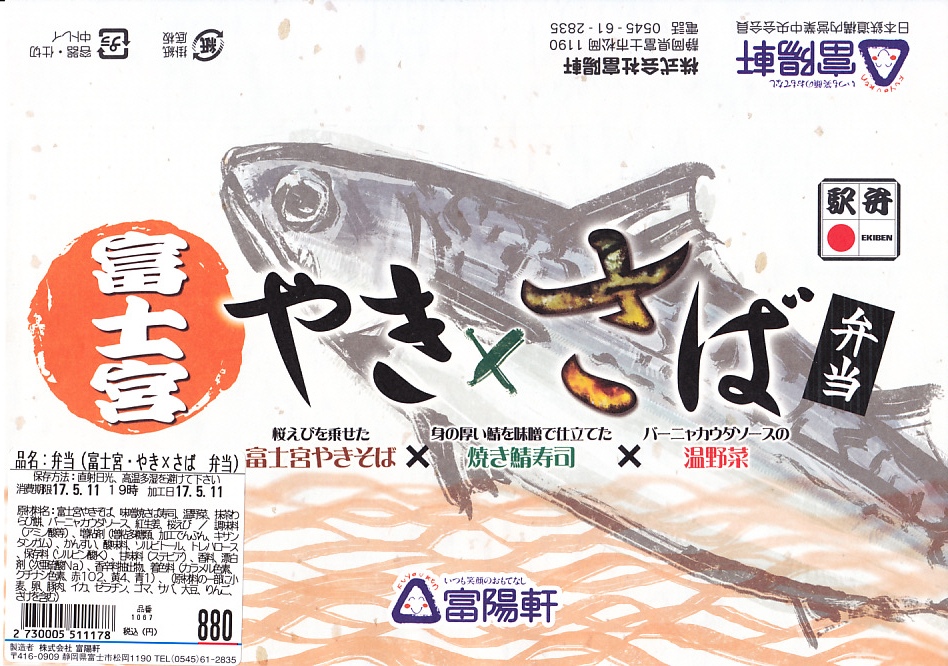 2017(平成29)年1月10日の発売。その名のとおり、そして掛紙に書かれるとおり、富士宮やきそば、焼き鯖寿司、温野菜の詰合せ。正方形3個分の横長な容器に、左から順に富士宮やきそば、味噌焼き鯖ずし、野菜の煮物とわらびもちを詰めていた。やきそばは富士宮の特徴である太さとコシとサクラエビを備え、やきさばは高級品レベルの身の太さ。野菜はおしゃれな見栄えと味。これはなかなか格好良い駅弁。しかし材料の終了を理由に、同年7月9日限りで終売。