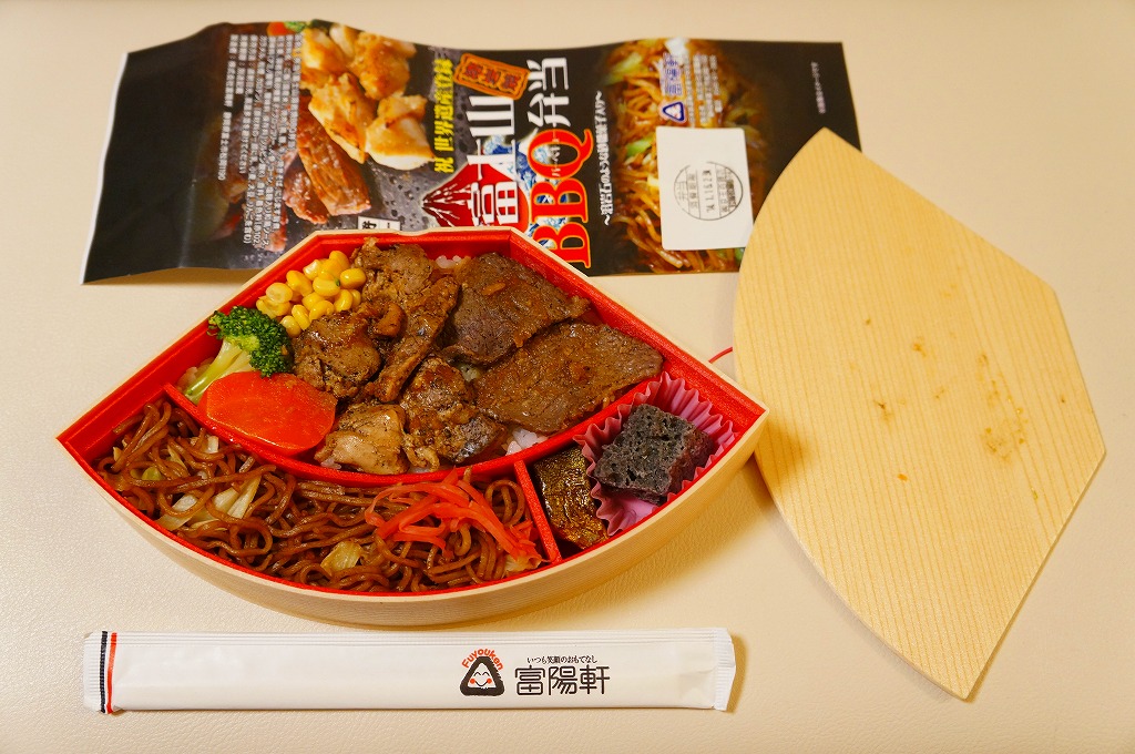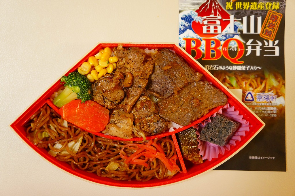 2014(平成26)年1月の京王百貨店の駅弁大会で実演発売。その会期中だけ、新富士駅でも販売したらしい。富士山の形に見えてくる容器に白御飯を詰め、催事場に持ち込んだ溶岩プレートで焼いた牛と豚と鶏の焼肉を貼り、ブロッコリーとコーンとニンジンを添え、焼きそばを詰めて、ニジマス旨煮と砂糖菓子を添える。焦げた肉の香り、もちもちの焼きそば、溶岩のような菓子をガリガリかじりながら、イベント向けの商品としてはワイルドで面白くて良いなと感じた。